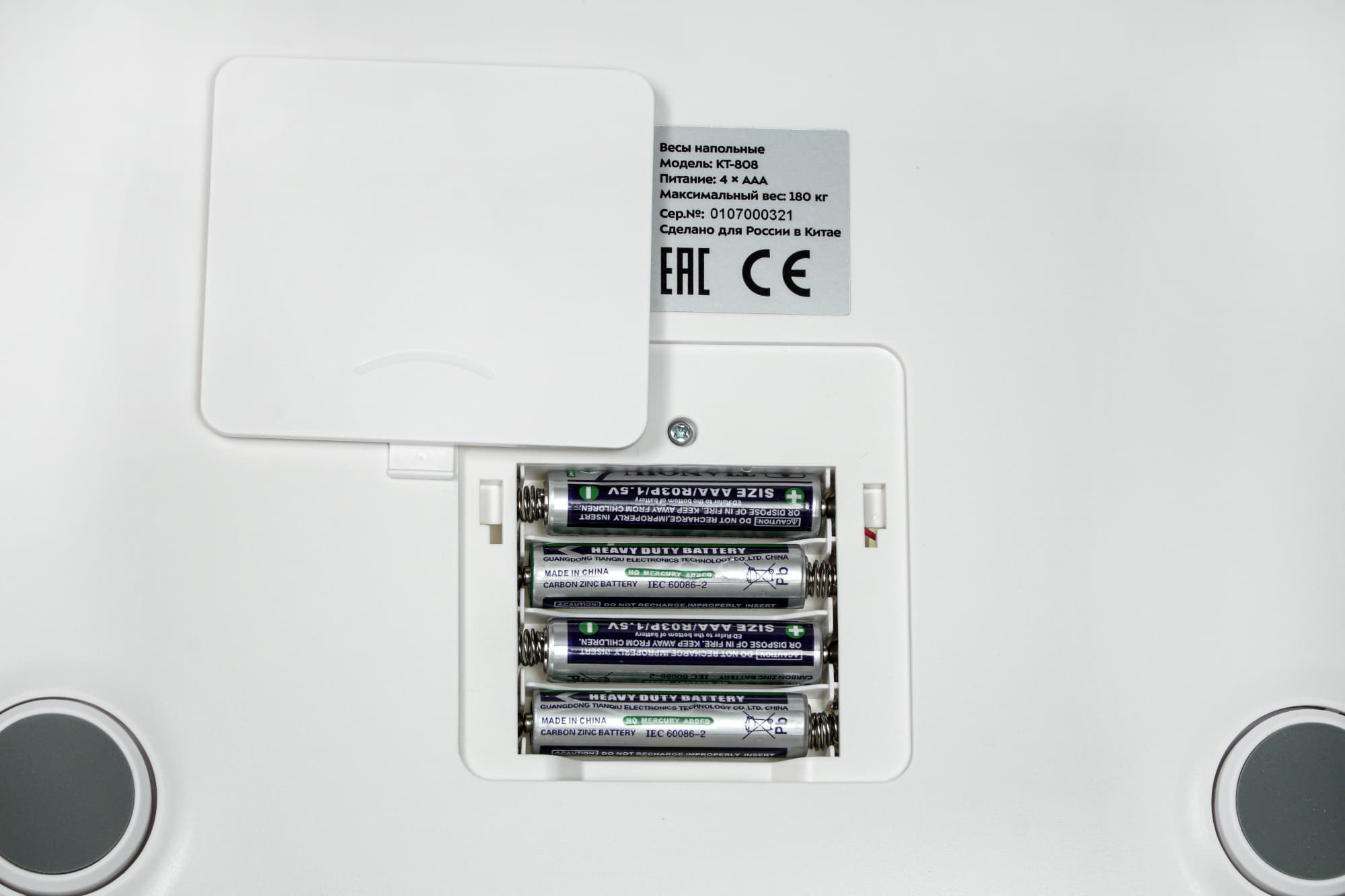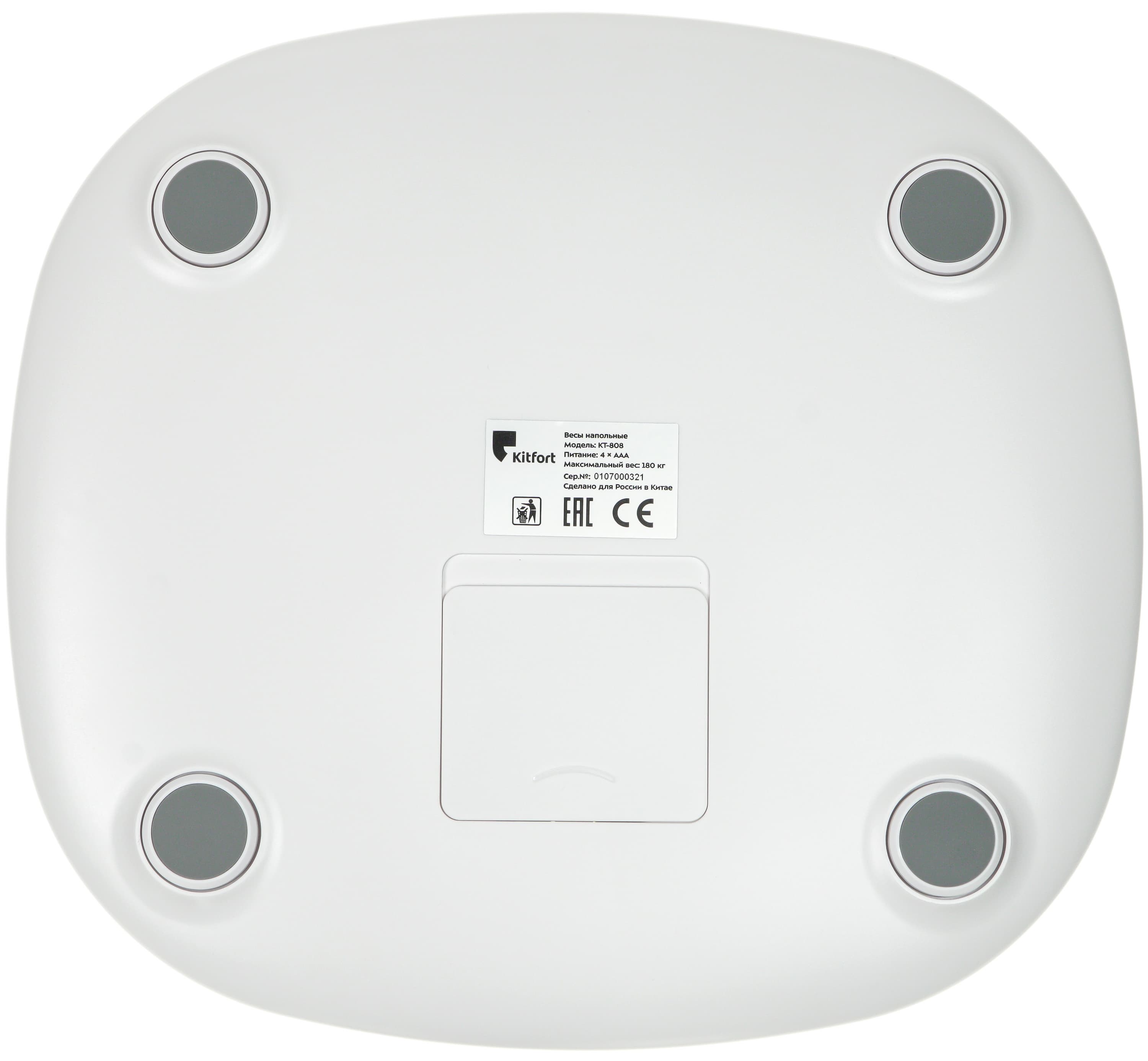 У этой модели четыре круглые ножки с прорезиненными накладками — чтобы не скользили по кафелю или паркету. В центре нижней панели мы видим наклейку со стандартными данными: названием модели, серийным номером и краткими техническими характеристиками (тип и количество элементов питания, а также максимальный вес, которым можно нагрузить платформу).