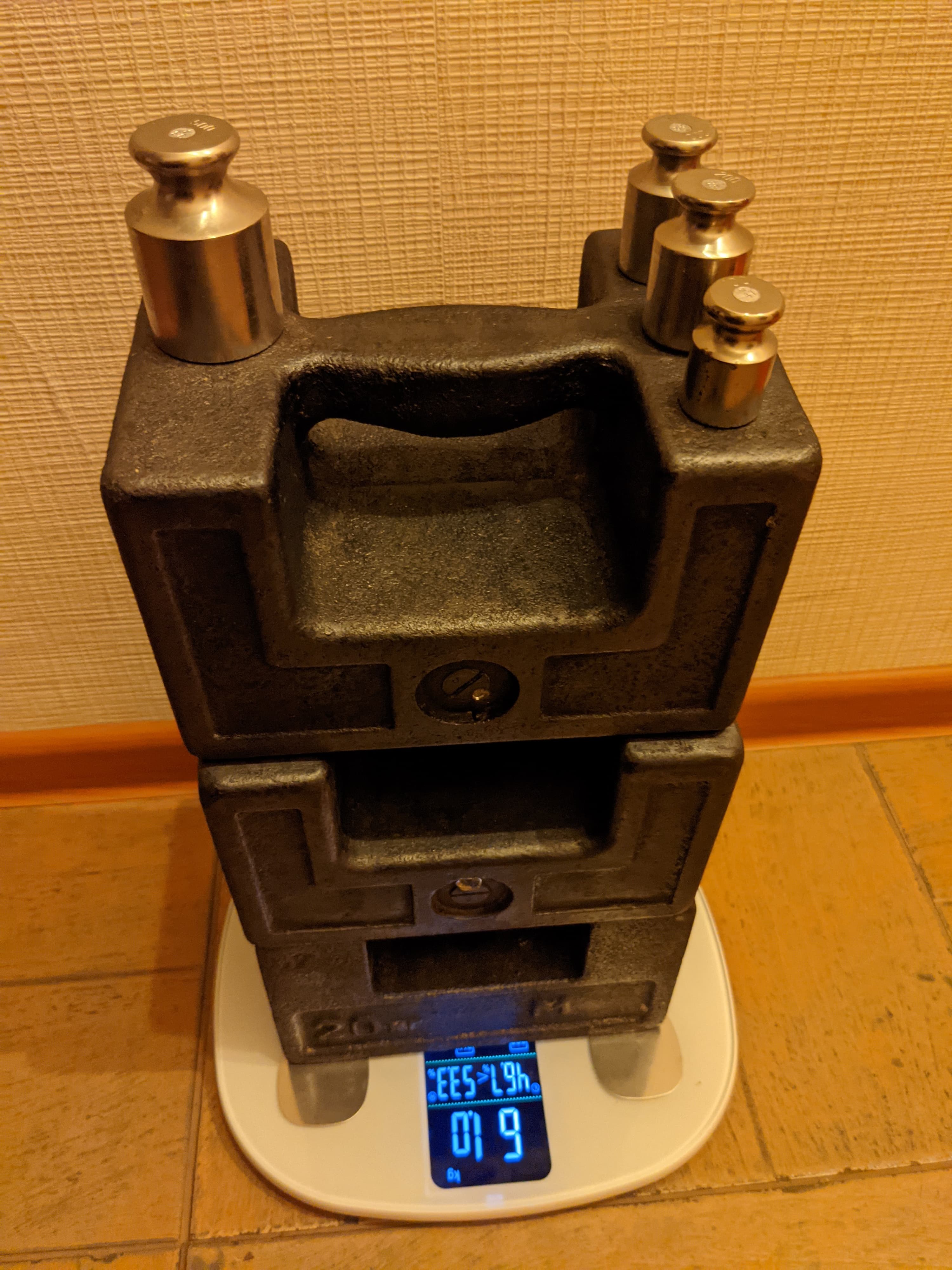 Чтобы оценить правильность показаний Kitfort KT-808, мы воспользовались тремя 20-килограммовыми поверочными гирями класса точности М1 и набором лабораторных разновесов 4-го класса точности массой от 100 до 500 г.