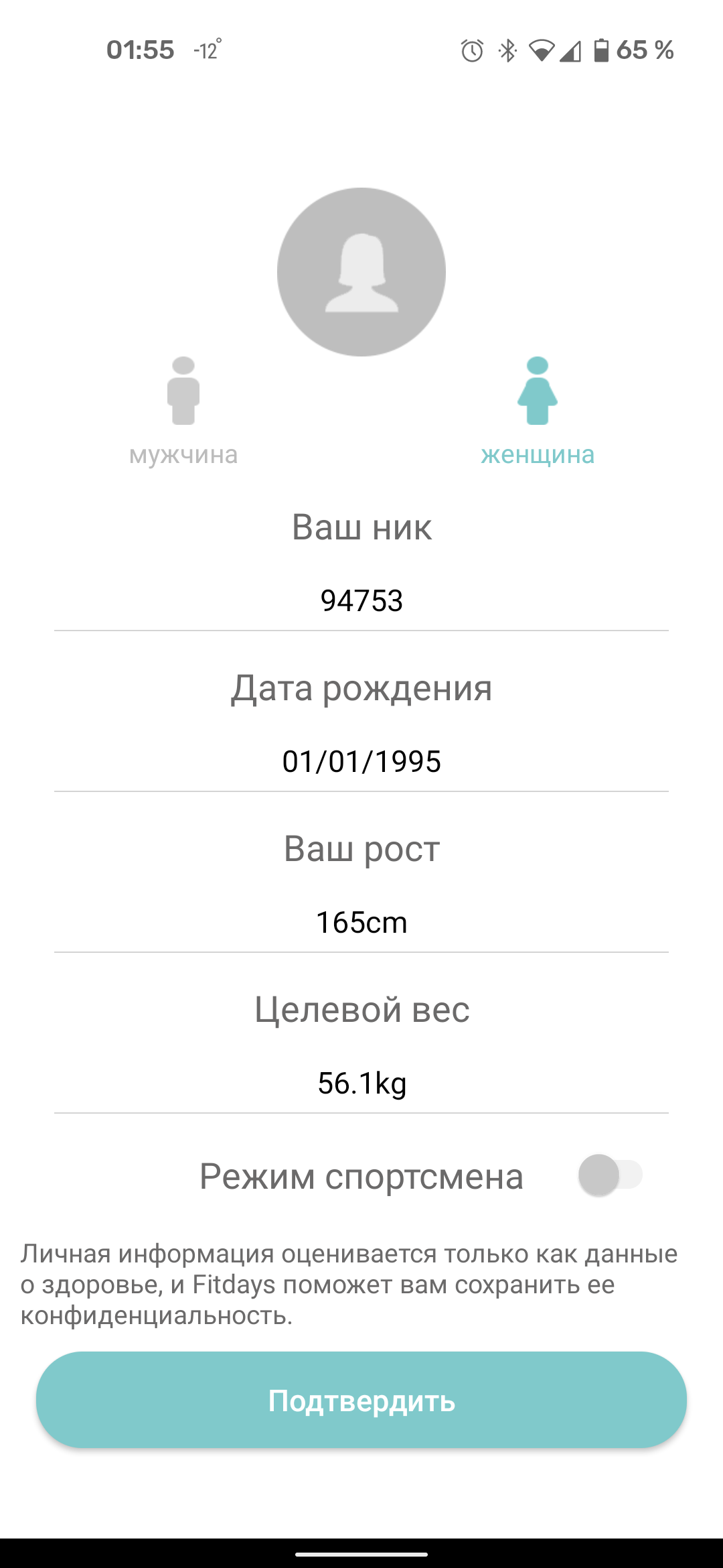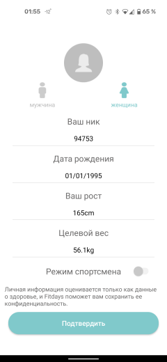 При первом запуске Fitbit требует почтовый адрес и пароль. На следующем шаге пользователь заполняет анкету со сведениями для более точных рекомендаций — пол, возраст, рост и вес.