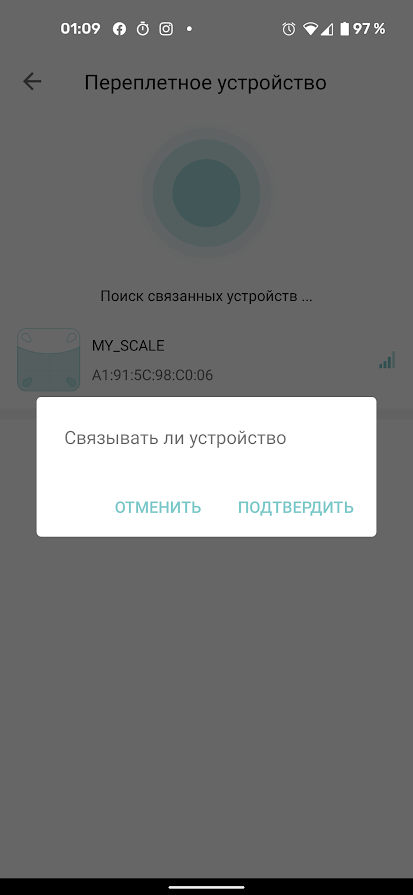 Включенные весы легко определяются автоматически, но если надо, можно найти их вручную (найденный прибор появляется под названием «переплетное устройство» — русский перевод кое-где прихрамывает).