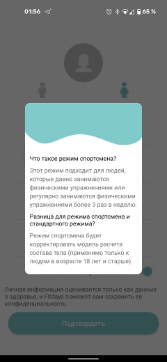 В приложении можно выбрать спортивный режим для активно занимающихся физкультурой. В нем расчет модели тела немного отличается от обычного. Для правильной работы стоит также узнать о правильной методике измерений. Приложение требует доступа к местоположению устройства.