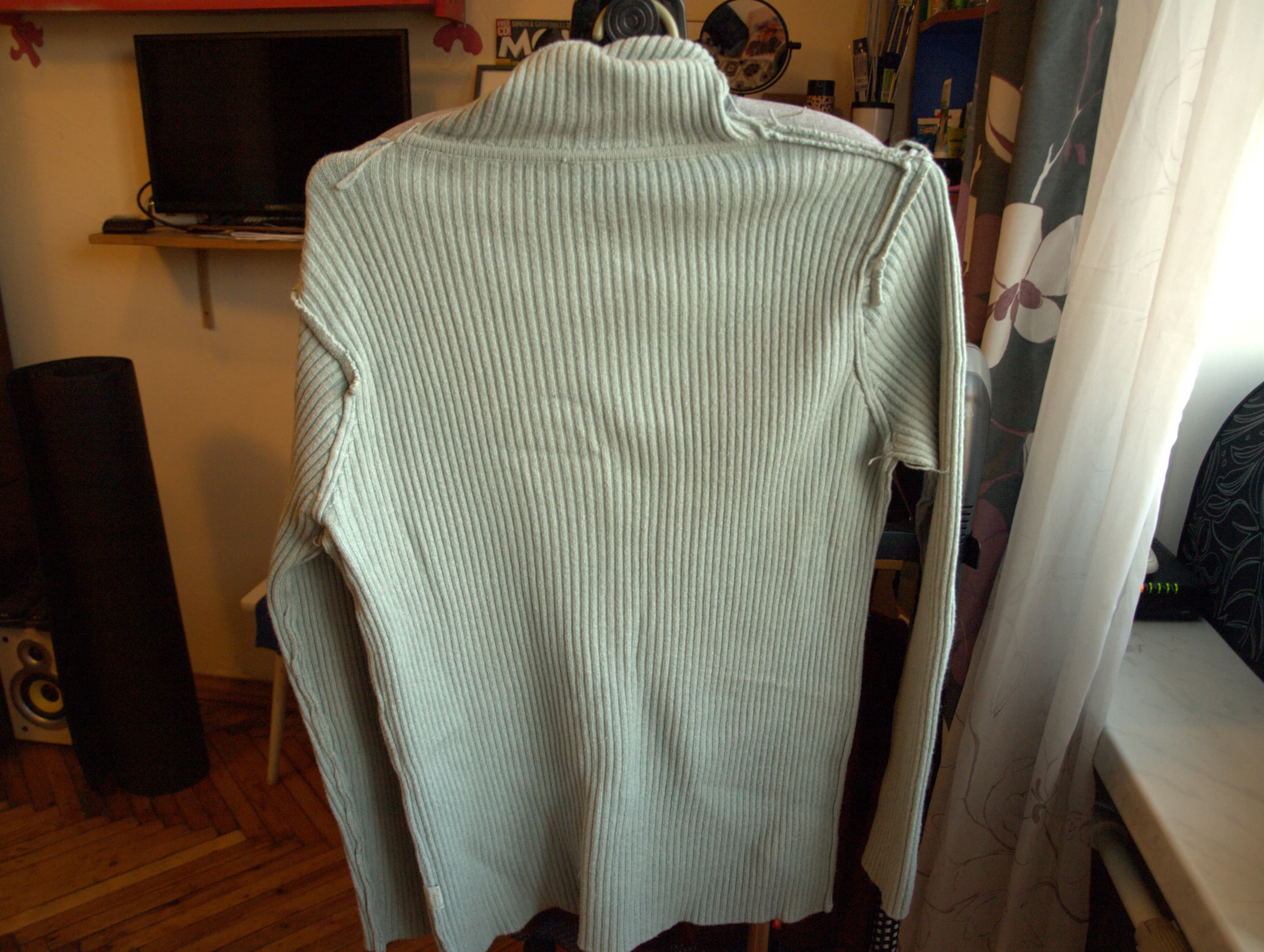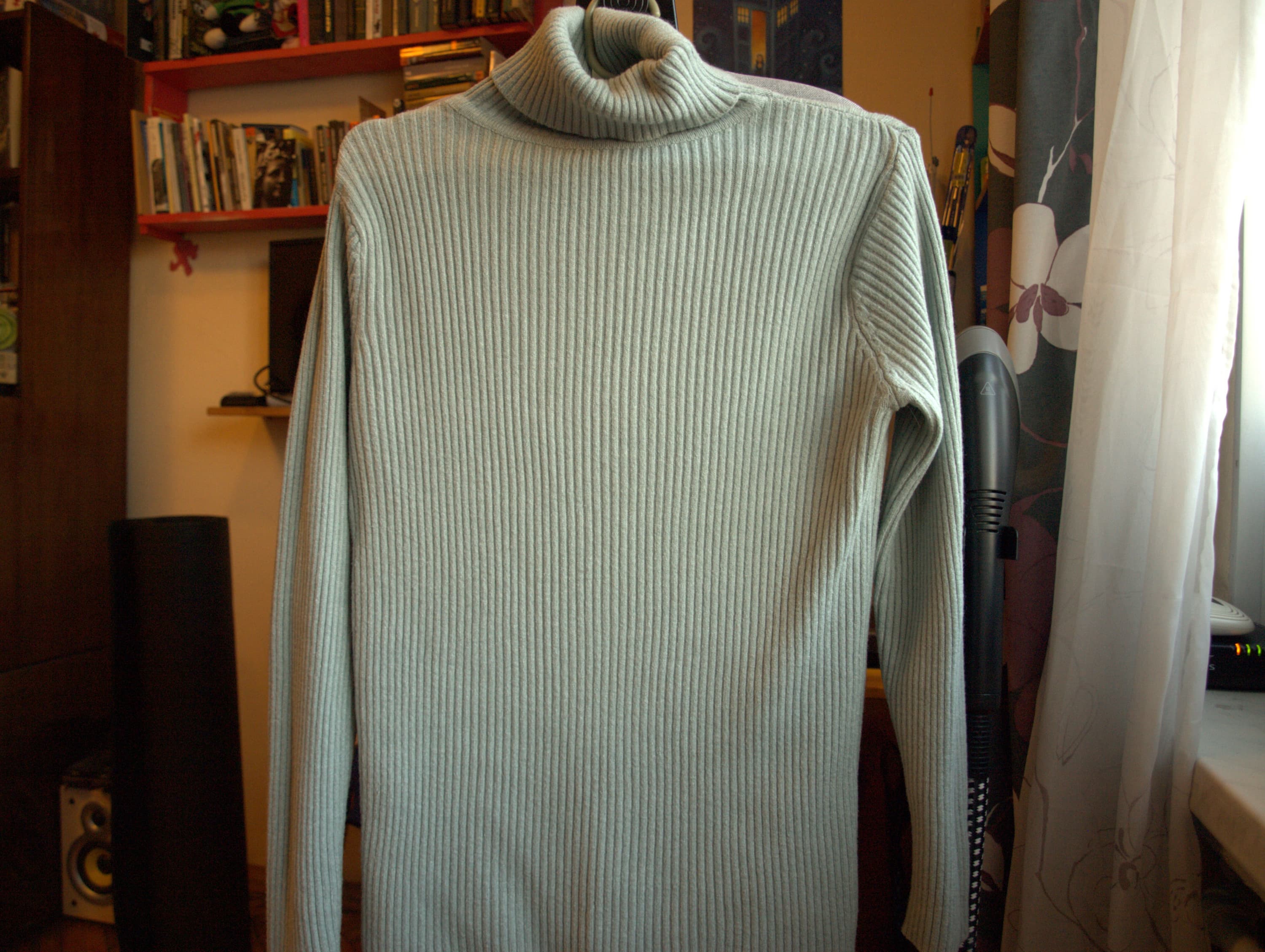 Водолазки — удобная базовая вещь в прохладное время года. Только одна беда, они не любят частой стирки, а между тем после каждой носки заметно деформируются, легко впитывают запахи и часто засаливаются на сгибах или в районе груди. Kitfort KT-9105 прекрасно справился со всеми проблемами бадлонов как в вертикальном, так и в горизонтальном положении - утюжка. Быстро (3-5 минут) и деликатно отпариватель приводил вещи в порядок. Приведем снимки сразу нескольких экспериментов.