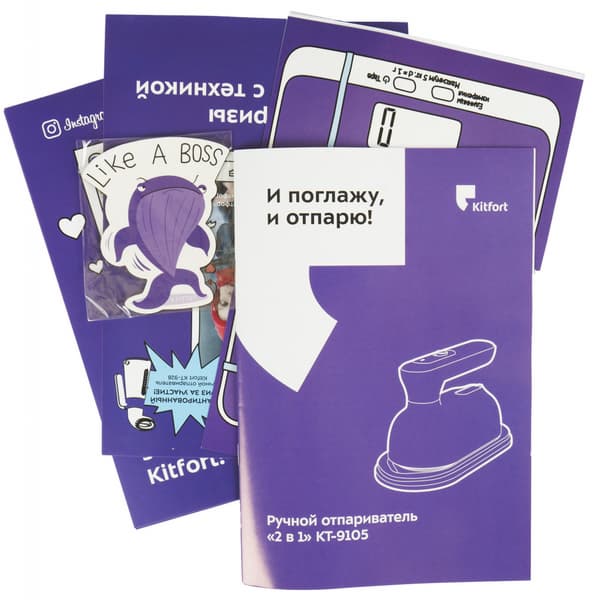 Традиционная инструкция Kitfort — небольшая, формата А5 на 16 страниц, брошюра в цветах бренда. В ней на русском языке ясно и четко изложены общие сведения, приведена комплектация списком и в схемах, перечислены технические характеристики и даны советы по использованию, уходу и хранению прибора. Почти все разделы инструкции сопровождают подробные рисунки или фотографии. Есть таблица с перечнем и решением возможных неисправностей, а также список мер предосторожности. На обложке слоган: «и поглажу, и отпарю».