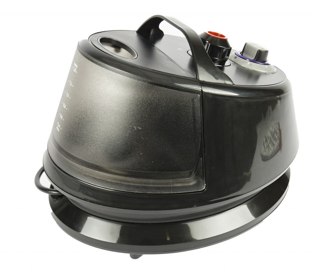 Резервуар для воды расположен позади корпуса. На его дне видно отверстие, через которое вода поступает в бойлер и к шлангу. Для его защиты установлен съемный фильтр. Со стороны резервуара расположен провод электропитания. Важное замечание: клапан для набора воды расположен не сверху резервуара, а снизу. То есть, легко вытащив его из корпуса, нужно перевернуть деталь и открутить защитный фильтр.