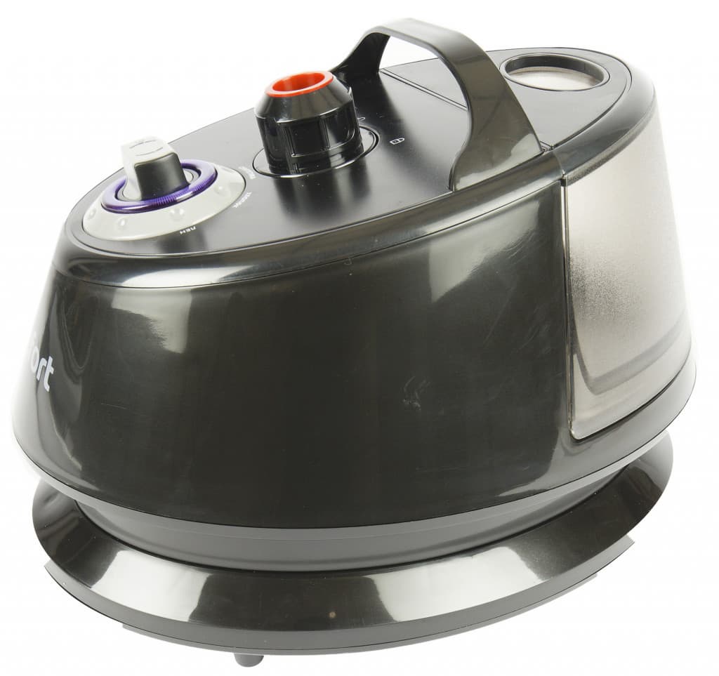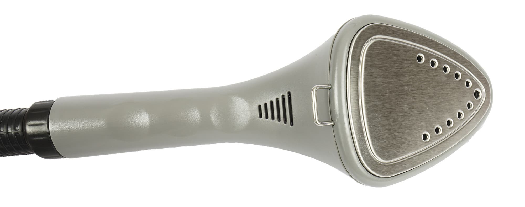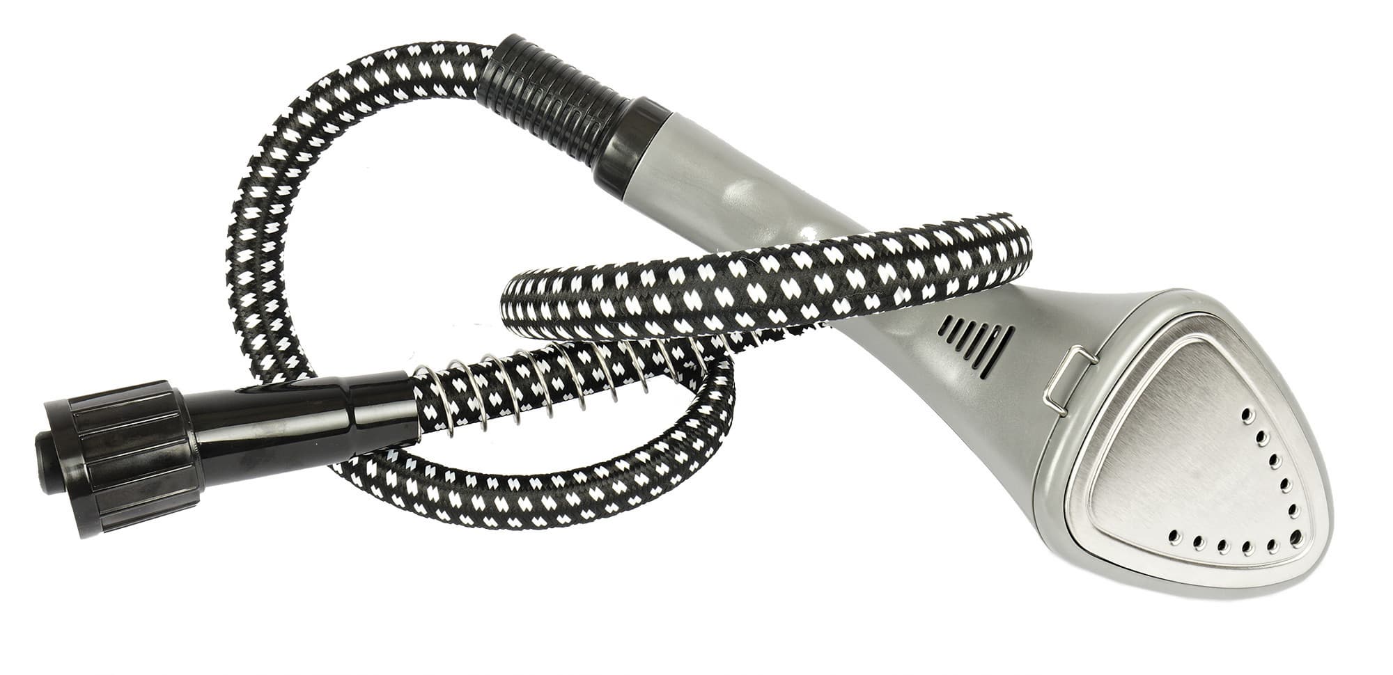 На корпусе заметна механическая панель управления, с индикатором и четырьмя режимами работы работы. Инструкция подсказывает, что названия режимов «шелк», «синтетика», «хлопок», «лен» условны, не привязаны к типам ткани. Здесь «шелк» — минимальная подача пара, а «лен» — максимальная. Место соединения парового шланга с корпусом приметно, расположено по центру панели. Шланг длиной 1 м защищен от перегибов кожухом металлической пружины.