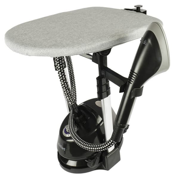 Отпариватель выдержан в черно-серебристой гамме, подходящей для любого дизайна помещения. В спокойных, нейтральных тонах. Прибор смотрится элегантным и аккуратным. Стойка основания корпуса устойчива, предлагающиеся к нему стойки надежны и легко собираются и регулируются по высоте, а также легко фиксируются в гнездах. Сложнее с установкой гладильной доски, это требует неторопливой сборки. Держатели для утюжка и вешалки — тоже удобные и простые в сборке и использовании.