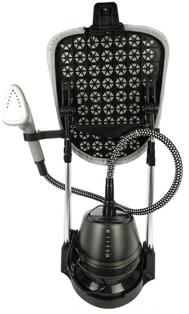 Гладильная доска фиксируется в трех положениях: горизонтально, вертикально, под углом в 45°. Венчает ее крючок для вешалки, что заметно облегчает работу с аппаратом. Для положения доски необходимо потянуть вниз пластиковую ручку на спине доски и повернуть ее в нужное положение. Съемный чехол сделан из прочной ткани, изнутри уплотненной слоем поролона.
