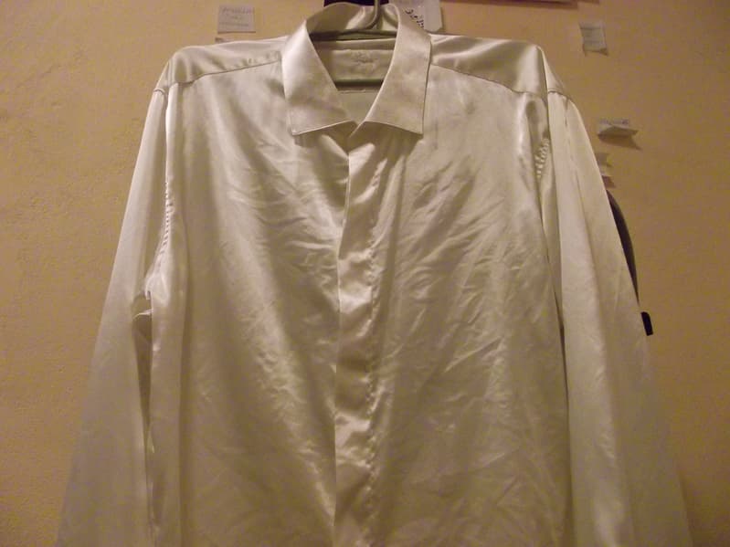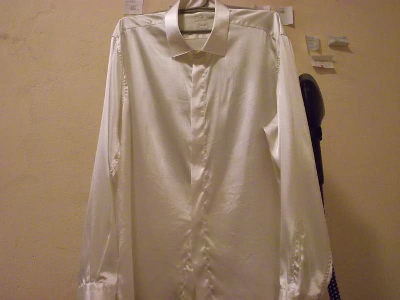 Вертикальная позиция, минимальный режим. Отпариватель легко загладил помятости, справился с углами и воротником. Приятный бонус: так очень легко поправить случайную примятость на офисной рубашке или блузе. Это быстро и, если вещь уже надевали, не оставляет сального блеска. Пар ко всему приятно освежает рубашку менее чем за пять минут.