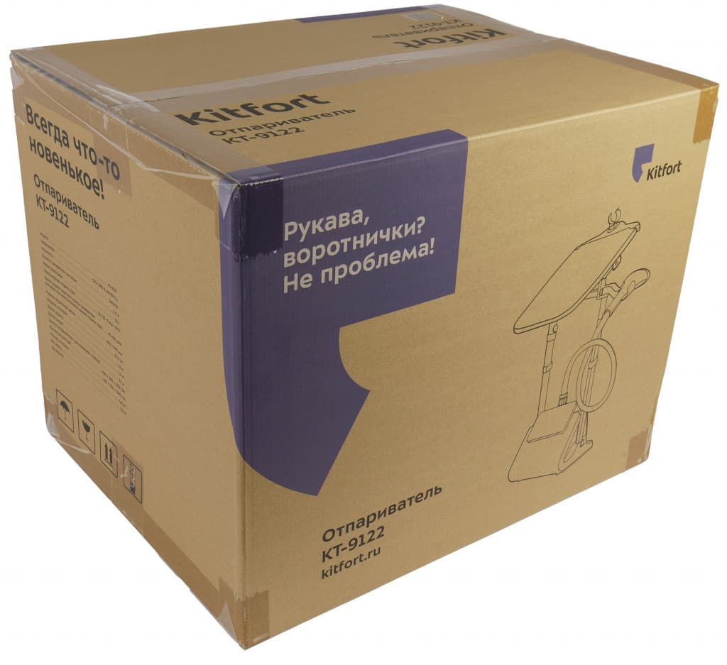 Отпариватель упакован сразу в две крафтовых, надежных коробки. На внешней логотип бренда и краткая характеристика на двух языках, русском и английском. На ней же указаны параметры самой коробки. Внутренняя выполнена в фирменных цветах и немного дублирует основную информацию. Внутри Kitfort КТ-9122 убран в полиэтилен и надежно закреплен креплениями из пенопласта. Ручки на коробках не предусмотрены.