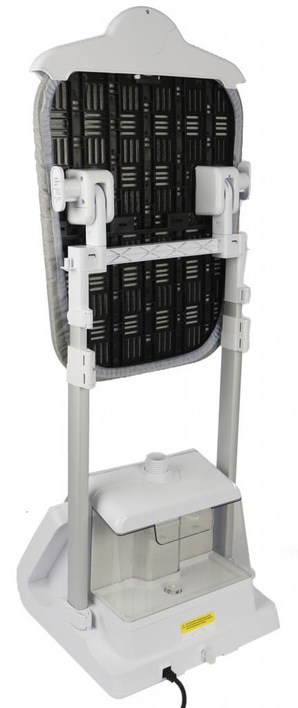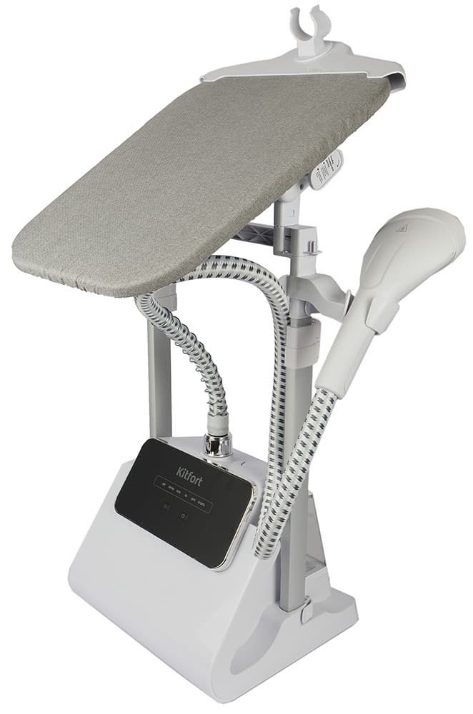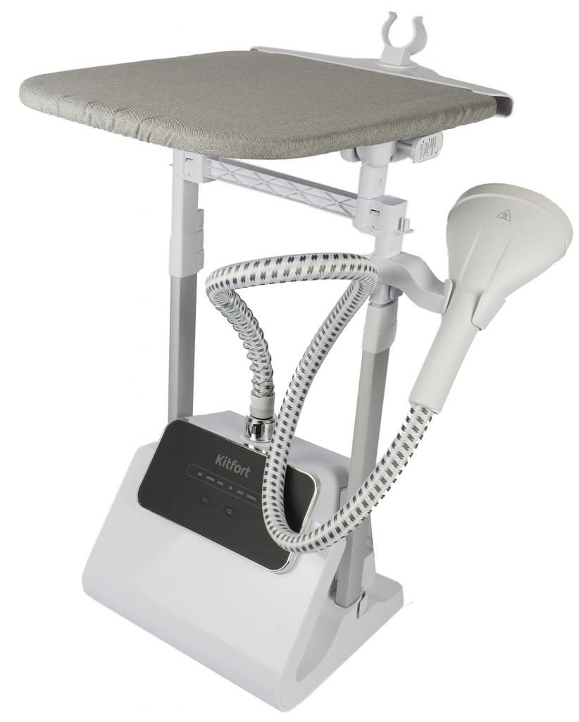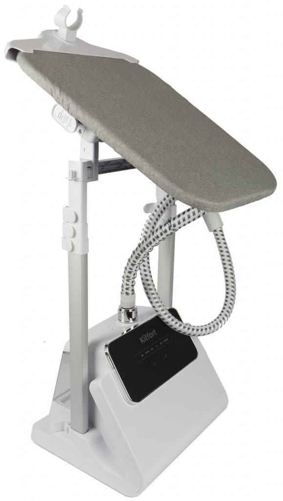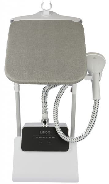 Kitfort КТ-9122 очень элегантен. После сборки весьма компактен для напольного отпаривателя. Сочетание белого цвета пластиковых деталей, серебра стоек из легкого металла и серой тканевой обшивки гладильной доски, плюс черная панель управления, делают его даже красивым. Он отлично вписывается в любой интерьер, не занимает много пространства и может использоваться как отдельная вешалка для подготовленной на выход одежды. Весьма удобно, если отпарил детский школьный костюм и оставил на видном месте.