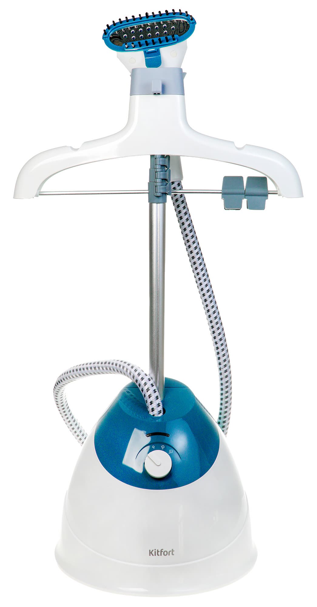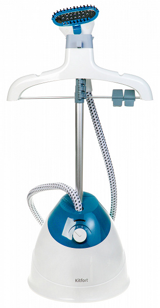Внешне отпариватель Kitfort KT-967 представляет собой корпус с емкостью для воды и стойку, на которой закреплена вешалка с держателем для парового утюжка. К корпусу присоединен шнур электропитания и паровой шланг с утюжком на его конце.