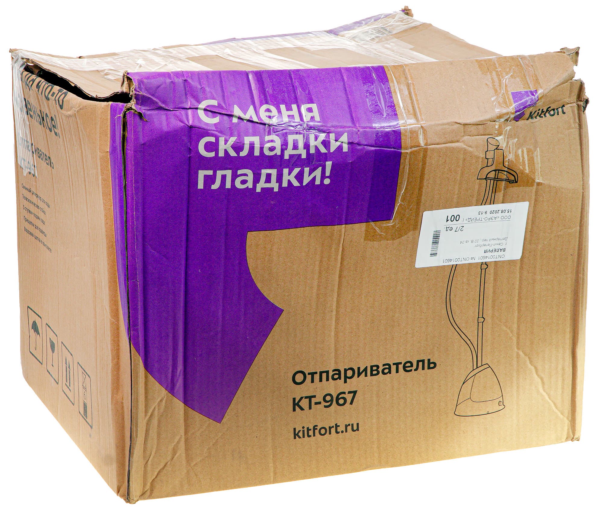 Упаковка, в которой находится Kitfort KT-967, оформлена в новом фирменном стиле Kitfort: неотбеленный картон, акценты в фиолетовом цвете, схематическое изображение прибора и минимум наиболее важной для пользователя информации. Вес коробки не очень велик — 4,5 кг. Приспособлением для переноски не оснащена.