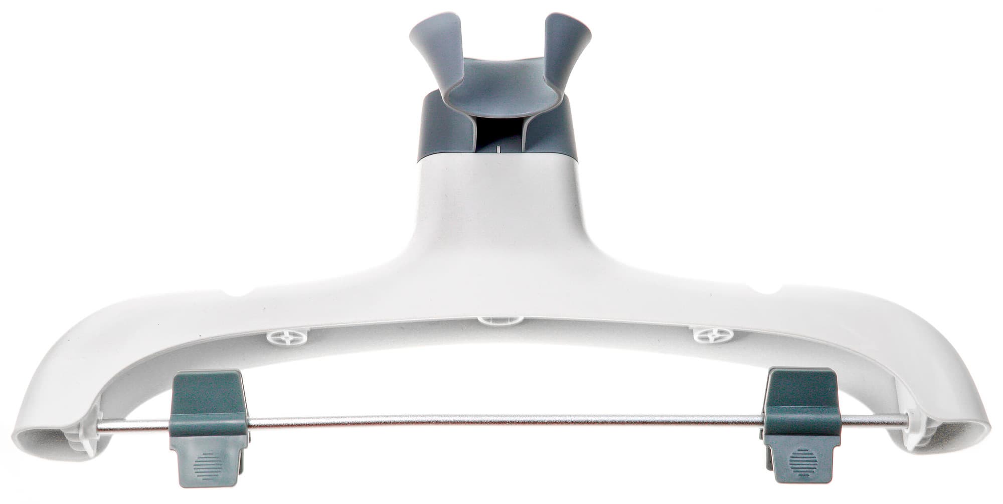 Вешалка с широкими плечами изготовлена также из пластика, снабжена крючком для размещения обычной вешалки с одной стороны и держателем парового утюжка — с другой. На тонкой перекладине закреплены две прищепки.