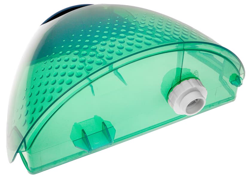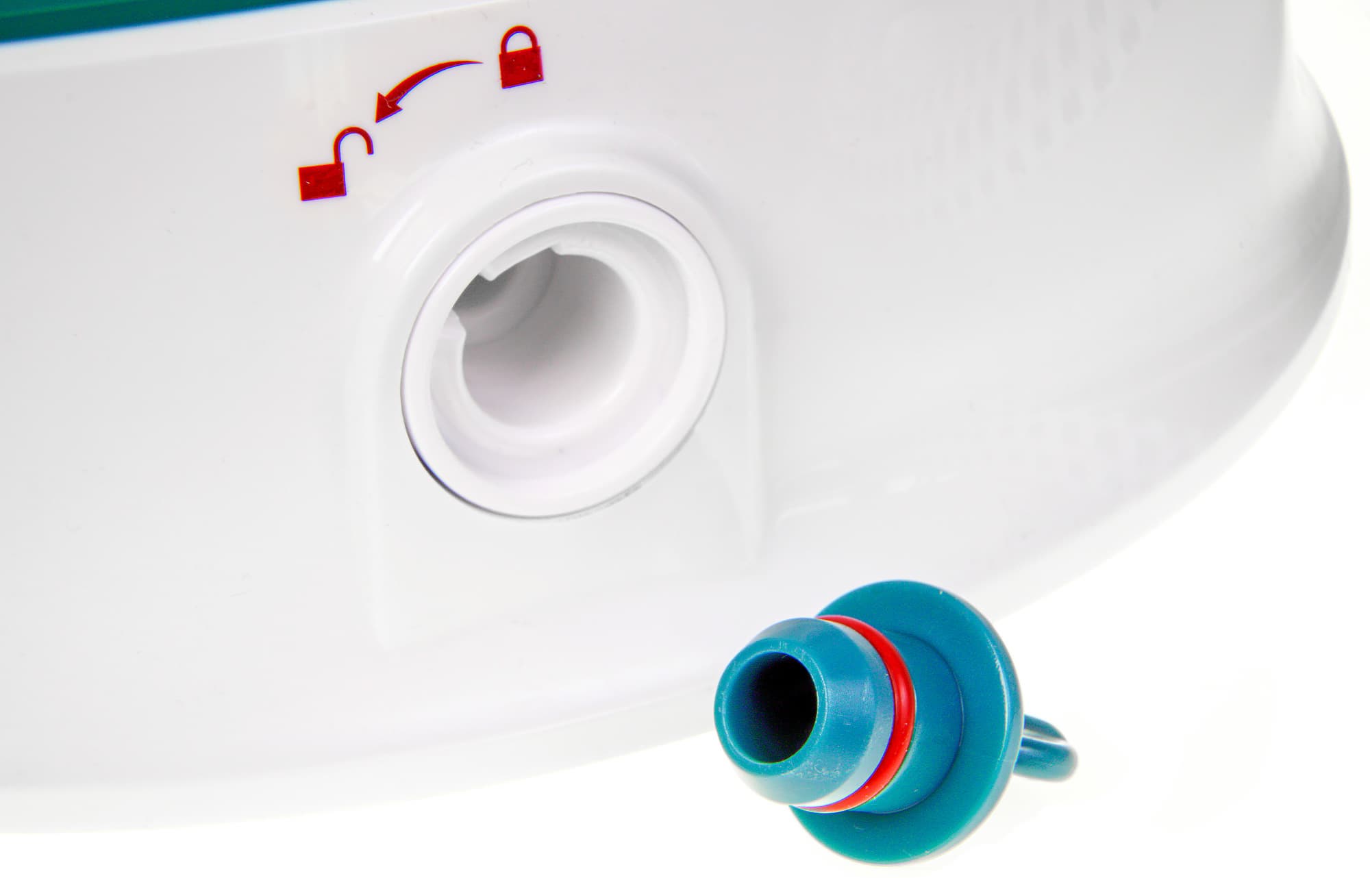 Съемный резервуар изготовлен из прозрачного пластика, что позволит наблюдать за уровнем воды во время работы. С внешней стороны имеется паз, который помогает без усилий извлекать резервуар. С нижней стороны мы видим пластиковый упор и белую отвинчивающуюся крышку. Откручивается деталь без усилий, с внутренней стороны снабжена резиновой прокладкой.