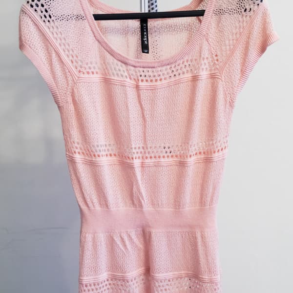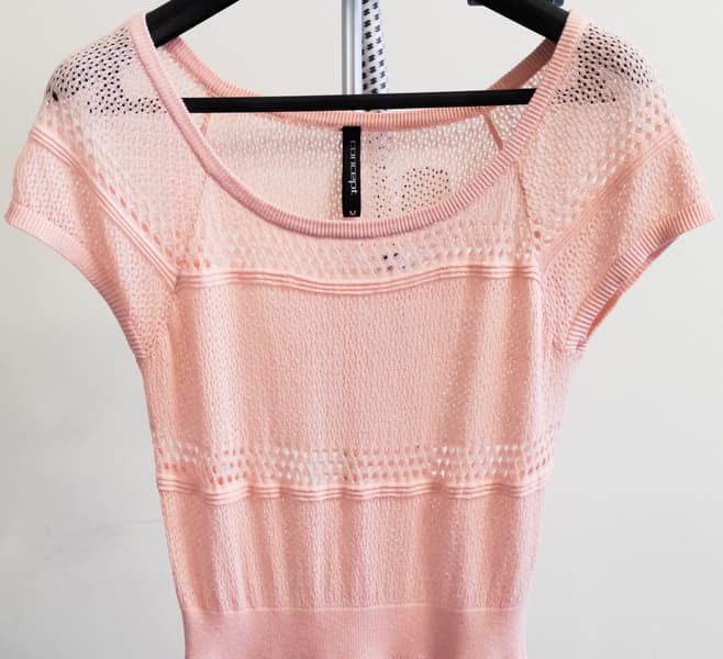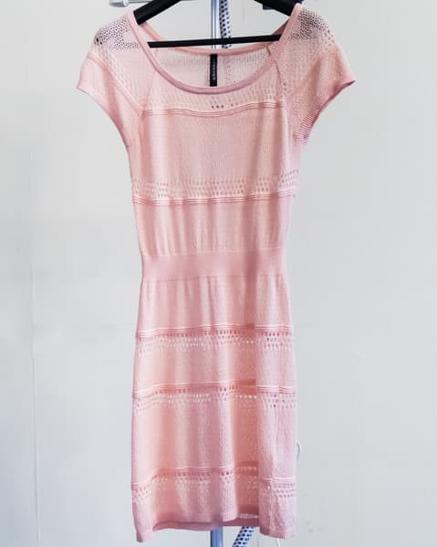 Платье изготовлено из тонкого объемного трикотажа. При глажении обычным утюгом на доске ткань присборивается, ее трудно расправлять, объемный вязаный узор становится плоским. Такого стиля и исполнения вещи идеально подходят для вертикального отпаривания.