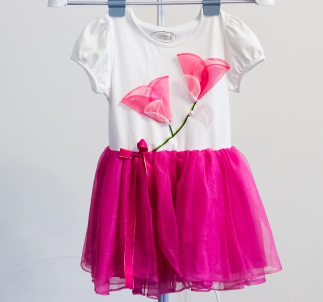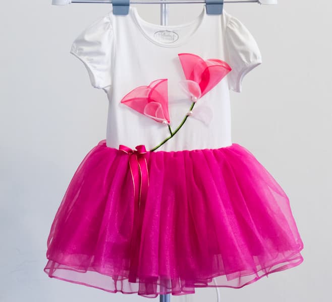 Детское платье с пышной юбкой нуждается лишь в том, чтобы его освежили. Хранилось оно на плечиках в шкафу, поэтому не мятое, не устраивает нас лишь внешний вид юбки. Юбка сложная, состоит из х/б подклада и трех слоев фатина. Верх платья трикотажный, как его гладить утюгом, автор вообще не представляет, потому что спереди имеются украшения в виде объемных цветов и нескольких крупных бусин.
