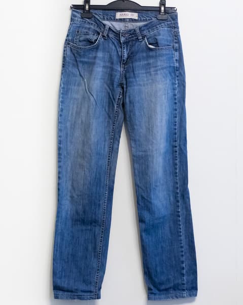 Гладили в два этапа. На первом разгладили штанины, подвесив их за нижнюю часть. Тогда даже не нужно было ничего расправлять и натягивать: штанины висели ровно и в натянутом положении под собственным весом. На втором этапе мы обрабатывали верхнюю, сильно мятую и сухую часть. Для этого установили гладильную доску под углом, джинсы подвесили за пояс. Обрабатывали, плотно прикладывая утюжок к ткани. Таким образом отлично отпарились толстые и трудные для глажки детали: пояс, карманы и замок.