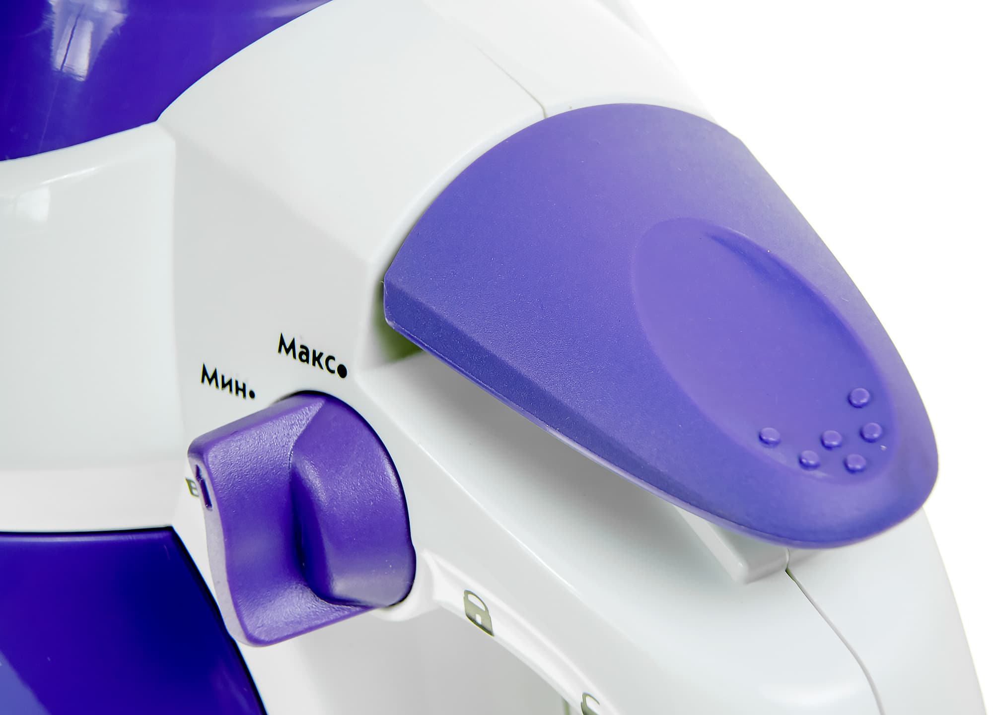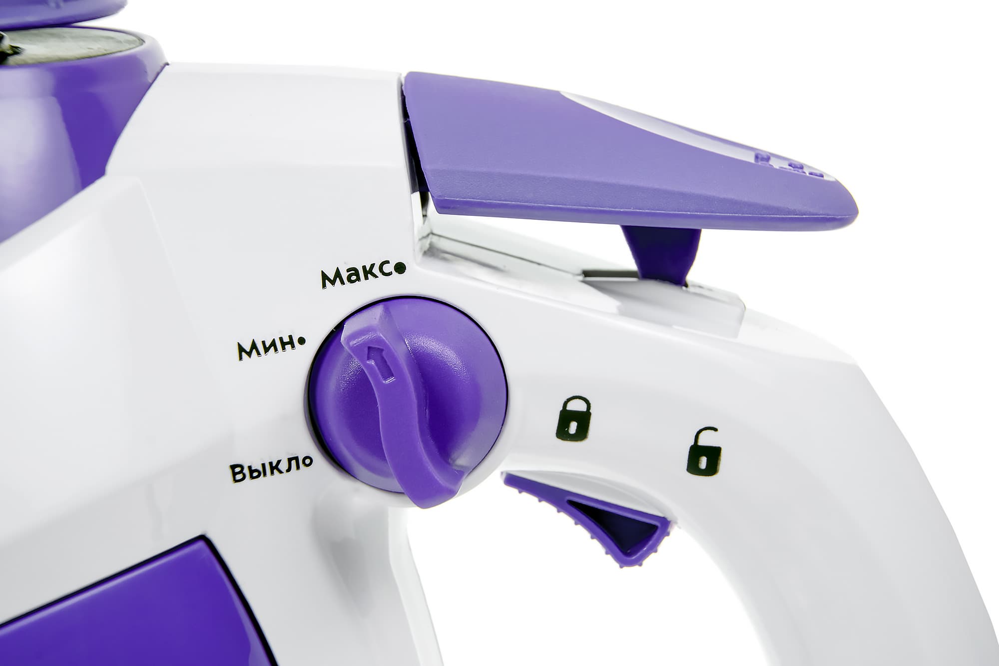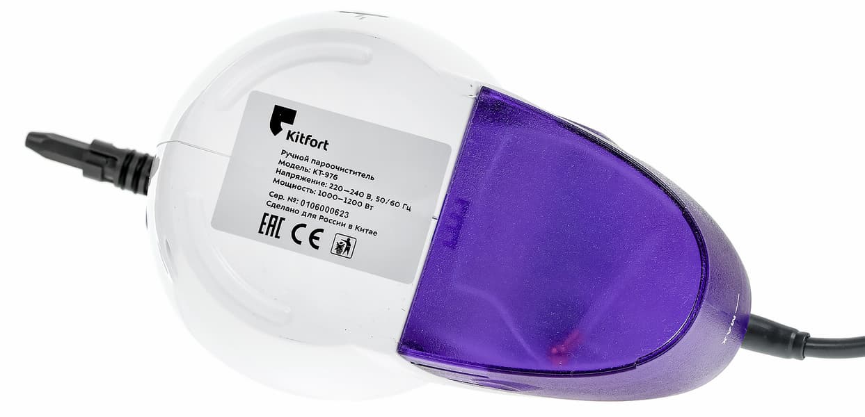 Ручной пароочиститель Kitfort KT-976 оформлен в белом и фиолетовом цветах. Прибор оказался неожиданно увесистым для столь небольшого по размерам устройства — 1,4 кг. Недолго покрутив его в руках, можно понять и конструкцию, и назначение кнопочек и рычажков. Вообще пароочиститель имеет устойчивую форму, надежно стоит на поверхности. Ручка удобно располагается в ладони, рычаги управления находятся рядом с большим или указательным пальцами.