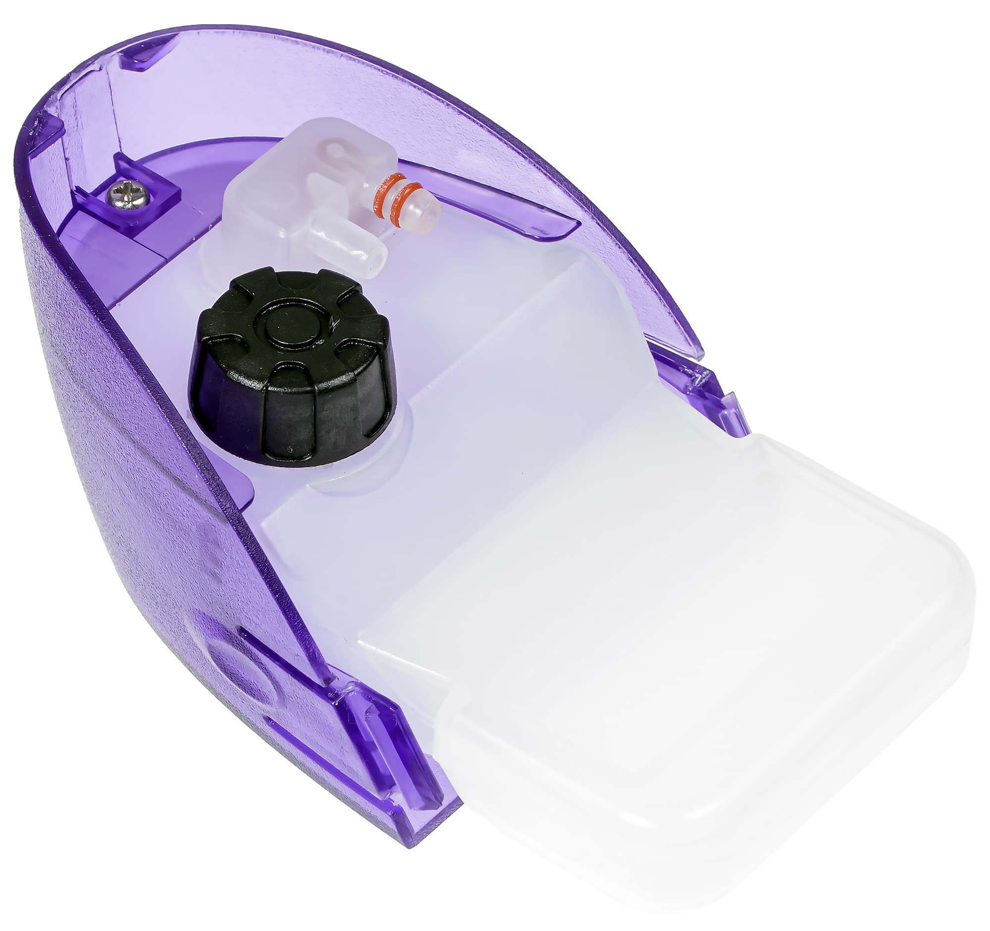 Емкость фиолетового цвета, расположенная под ручкой — это резервуар для моющего средства. Извлекается он с определенным усилием, несмотря на наличие на его поверхности специальных углублений под пальцы. На эти углубления следует надавить, поскольку они управляют фиксаторами. Длины пальцев автора с трудом хватило, чтобы дотянуться до углублений, для надавливания пришлось подключать вторую руку. Сверху на емкости имеется крышка. Отверстие диаметром в 1,5 см представляется нам достаточным для беспроблемного заполнения резервуара. Его максимальный объем — 150 мл.