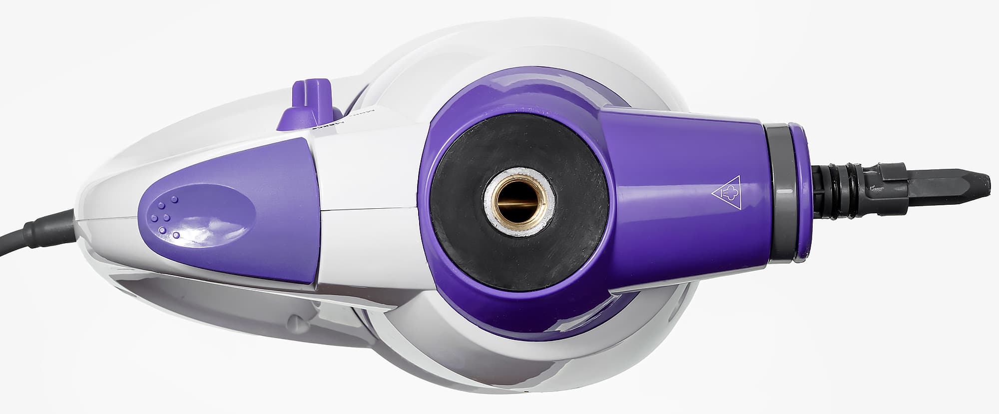 Паровое сопло выходит с левой стороны корпуса. Именно на нем фиксируется паровой шланг или струйная насадка, на которой, в свою очередь, могут быть закреплены все остальные щетки и скребки.