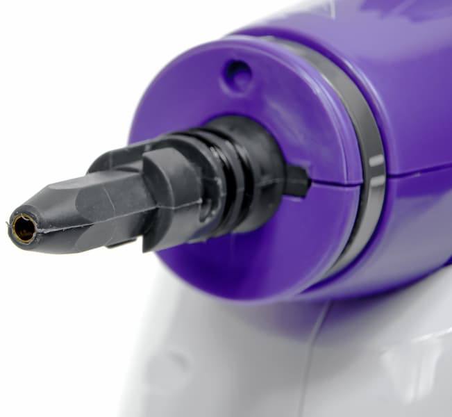 Струйная насадка надевается интуитивно понятным образом: ее необходимо надеть до упора и повернуть в направлении, указанном стрелочкой. Паровой шланг надевается таким же образом: нужно соединить указатель на паровом шланге с отметкой на корпусе и повернуть по часовой стрелке в направлении, указанном на детали. Для снятия следует потянуть фиксатор на себя и повернуть деталь против часовой стрелки. Очень просто и легко. Фиксируются детали надежно, не люфтят и не выскакивают из соединения.