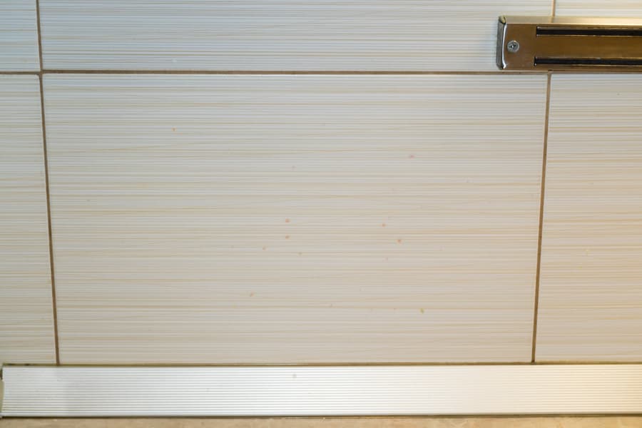 Кафель над кухонным столом не так, чтобы очень грязен, но на нем имеются засохшие брызги сока, налипшие капли от какой-то жидкой еды и другие подобные загрязнения.