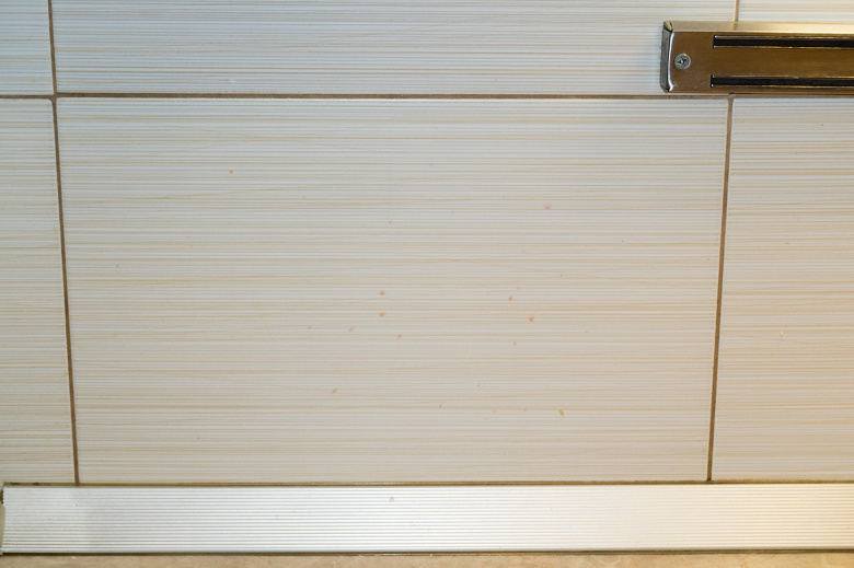 Сначала надели на пароочиститель скребок для стекла. После нажатия на кнопку подачи пара, участок кафеля становился влажным, загрязнения не скатывались вместе с водой вниз, но легко удалялись тряпкой, которая в любом случае идет следом за паром. Особо засохшие брызги пришлось удалять, надев на прибор насадку-щетку — при ее использовании стена становилась чистой, поэтому оставалось лишь протереть кафель, чтобы он стал сухим.