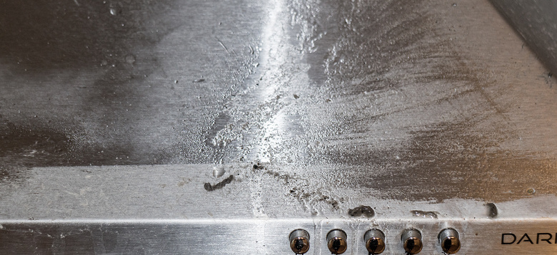 Начали тереть ворсовой щеткой с подачей пара. За тот промежуток, что шел пар, камера успевала полностью им наполниться, так что действовали мы чисто на ощупь. Как только ослабевала струя пара, прекращали давить на кнопку, немного терли, отставляли пароочиститель в сторону и протирали тряпкой. Загрязнения удалялись неохотно, тогда заменили ворсовую щетку латунной. Дело пошло чуть лучше. Видимых царапин на поверхности мы не заметили, а пятна, в большинстве своем, исчезли или значительно побледнели.