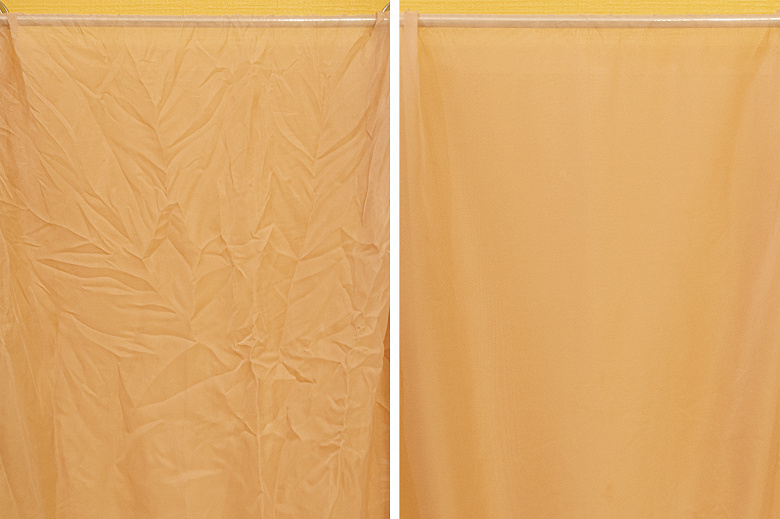 В процессе глажки ткань стала влажной, но после быстро высохла. Полосы и заломы, которые видны на итоговом снимке, на самом деле нарисованы на ткани.