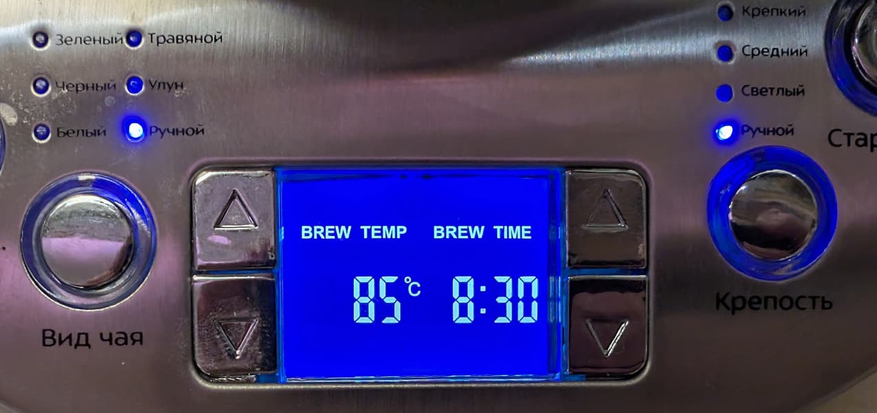 После этого можно выбрать желаемый рецепт чая и крепость напитка либо установить значения температуры и времени заваривания вручную с помощью стрелочных кнопок справа и слева от дисплея. Запуск чайника осуществляется нажатием на кнопку «Старт».