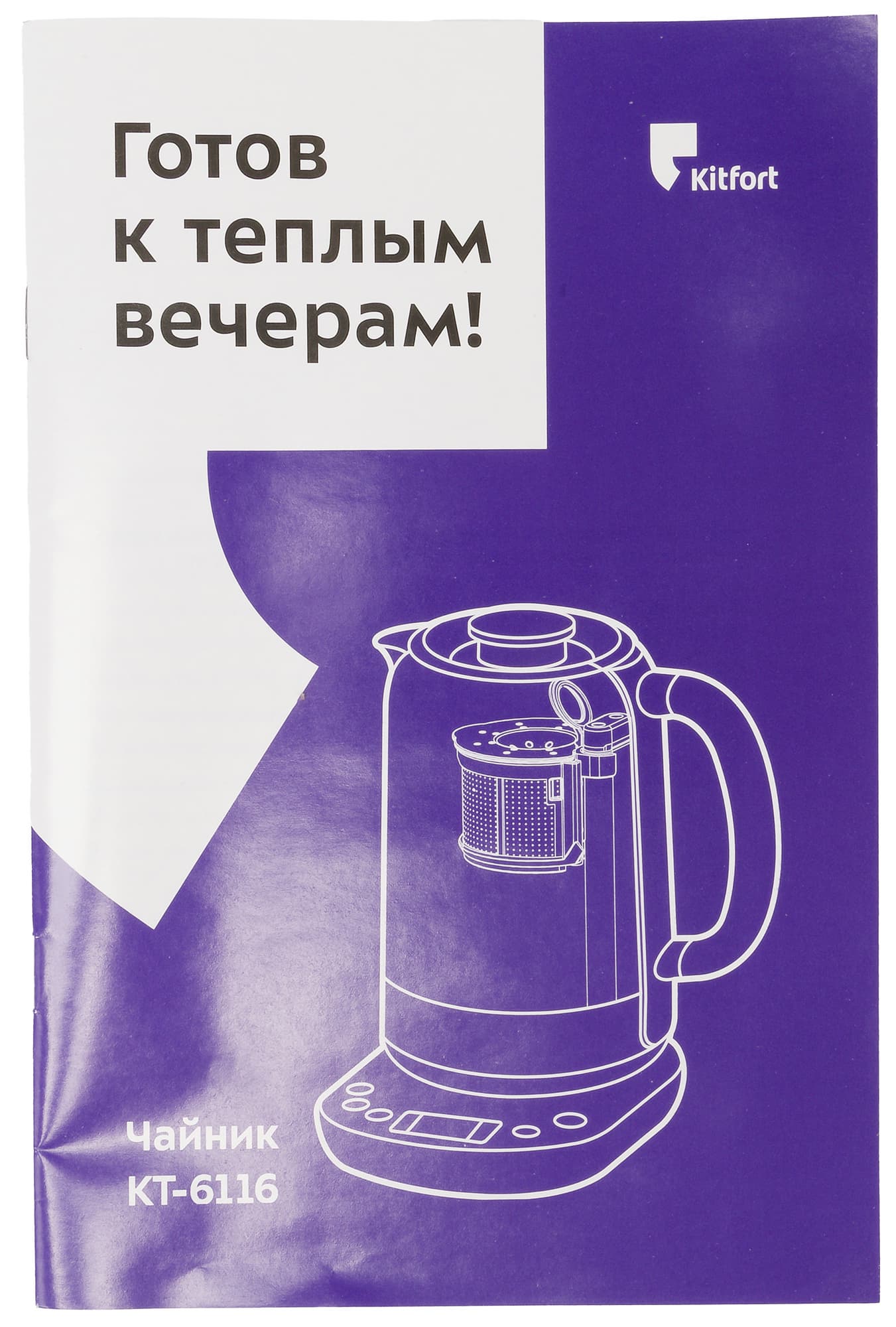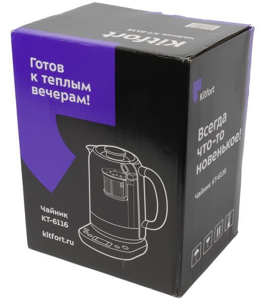 Чайник поставляется в черной картонной коробке, оформленной в узнаваемом фирменном дизайне Kitfort: помимо векторного изображения устройства, на передней стороне мы видим логотип производителя, ссылка на его сайт и традиционный слоган, который маркетологи компании придумывают для каждого типа бытовой техники. KT-6116 сопровождается девизом «Готов к теплым вечерам!».
