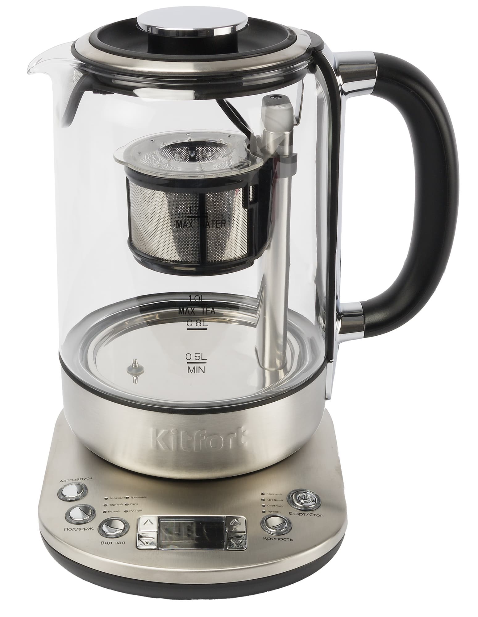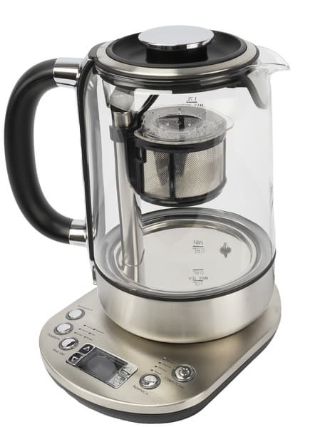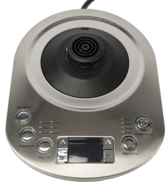Поиски были недолгими: новая модель KT-6116 того же производителя оказалась значительно более продвинутой, чем наш старый чайник. В ней нас заинтересовали автоматический механизм опускания и поднимания заварочной корзины с возможностью ручного управления временем заваривания и точная регулировка температуры воды.