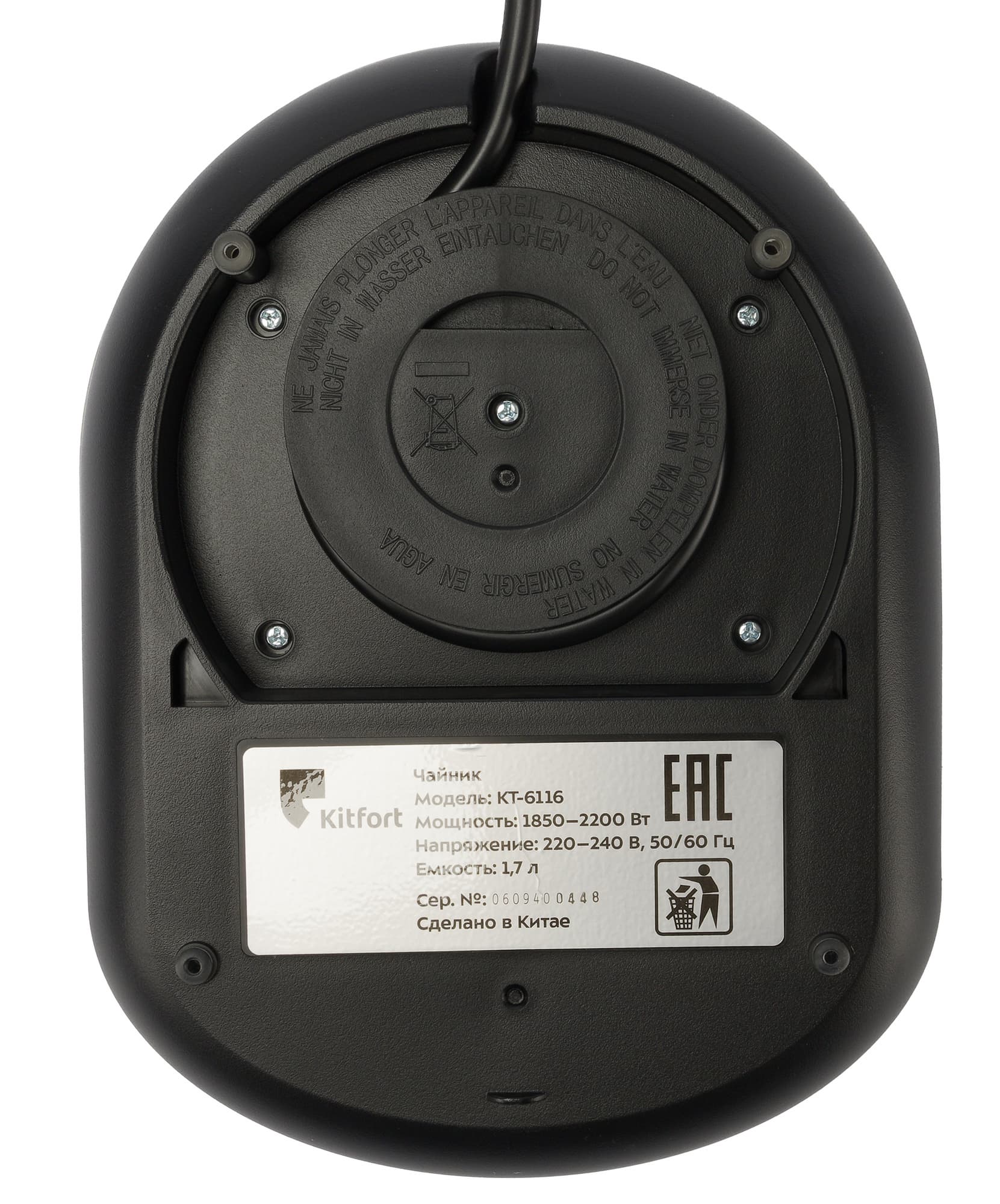 На дне базы предусмотрено место для хранения излишков провода. Здесь же мы видим обязательный шильдик с серийником, краткой информацией о производителе и электротехническими характеристиками.