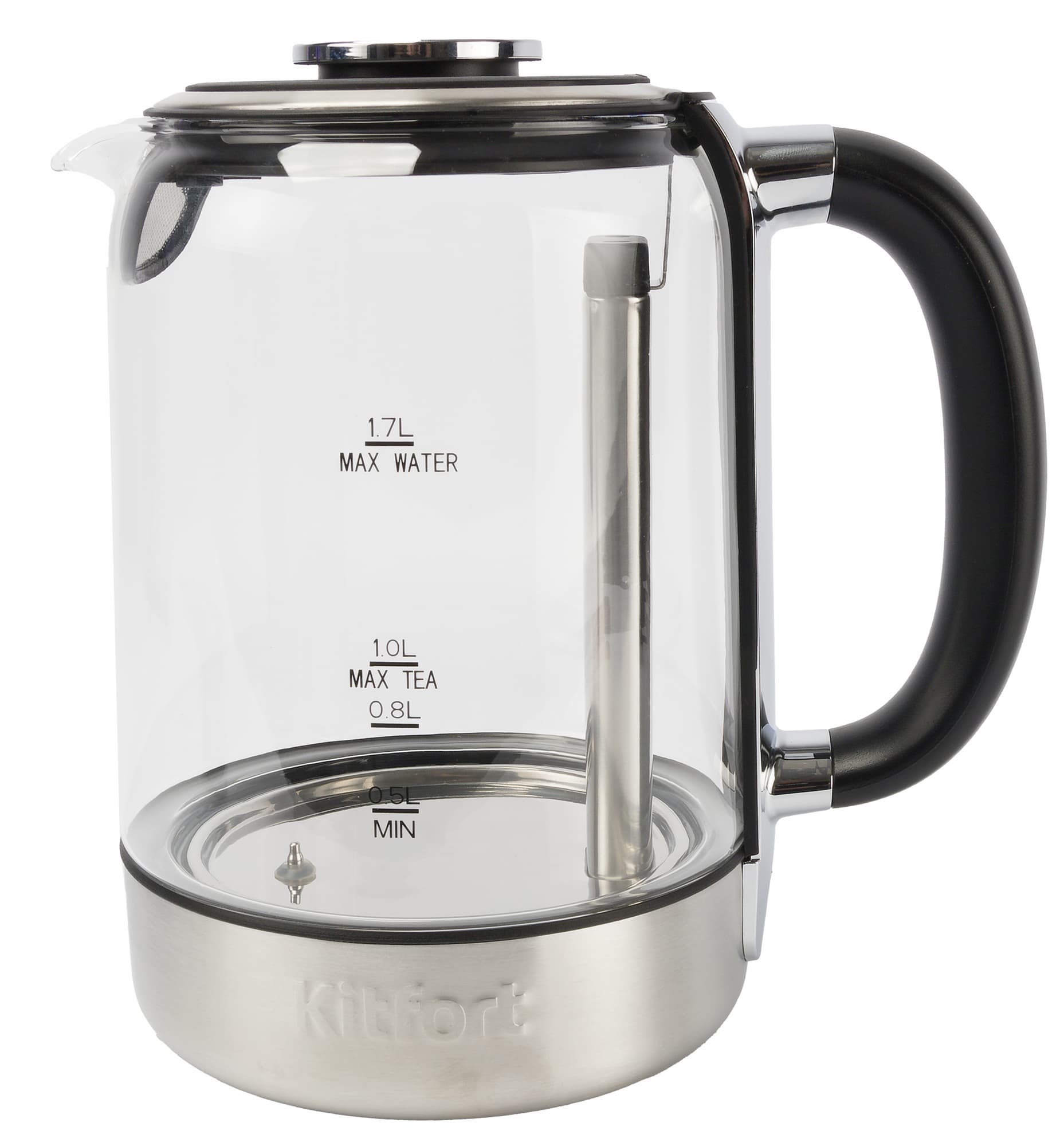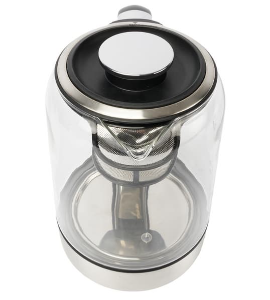Колба чайника сделана из закаленного стекла, через которое хорошо видна сложная конструкция внутри корпуса.