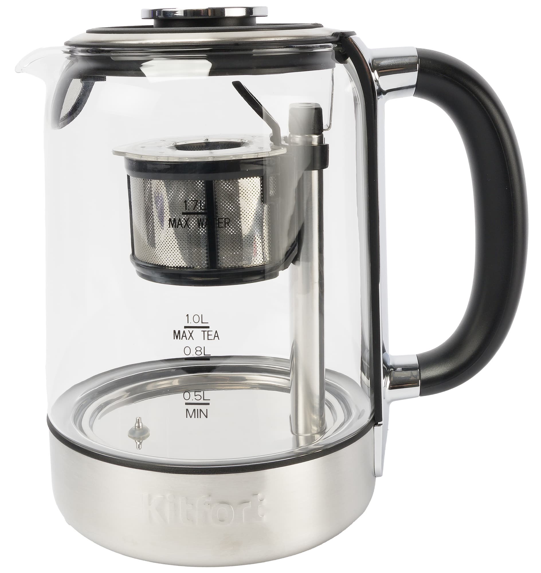 Как уже упоминалось, максимальный объем чайника в конфигурации для заваривания составляет 1 литр. Если уровень воды в колбе будет превышать отметку «Max tea», контейнер с заваркой не поднимется над поверхностью и заваривание будет продолжаться, а чрезмерная выдержка может испортить вкус напитка.