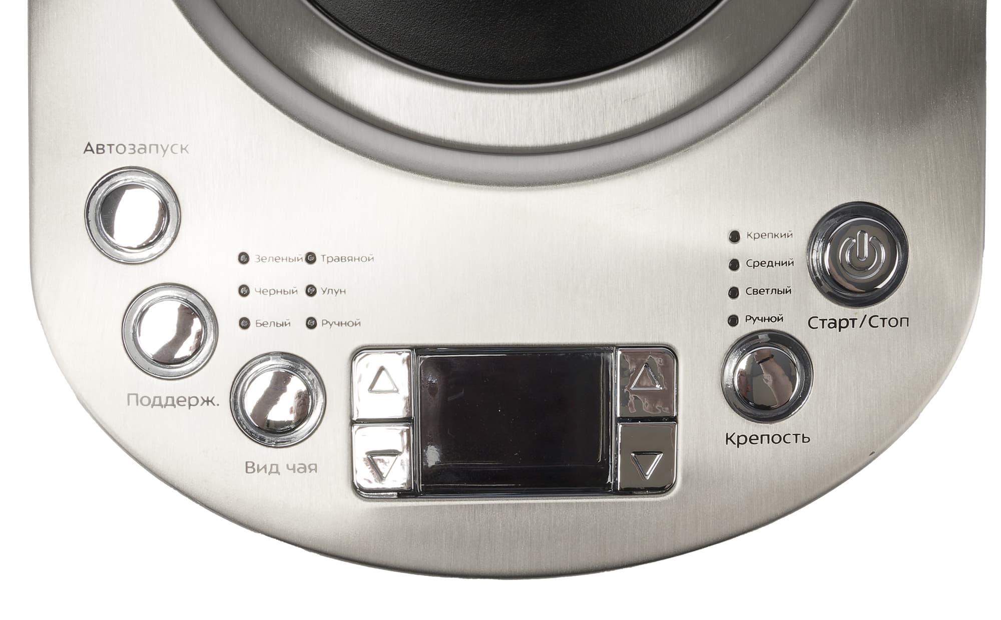 - «Вид чая»: последовательными нажатиями на кнопку можно выбрать один из шести предустановленных рецептов напитка: «зеленый», «черный», «белый», «травяной», «улун» и «ручной».