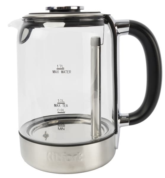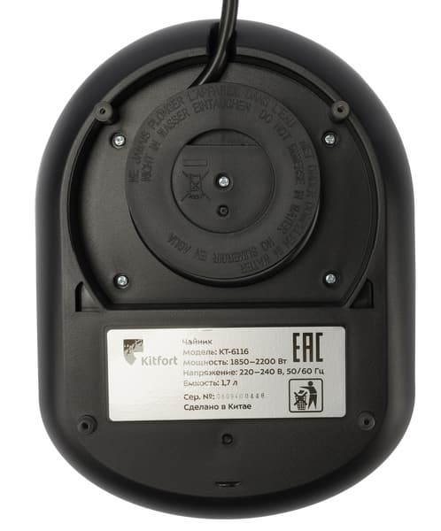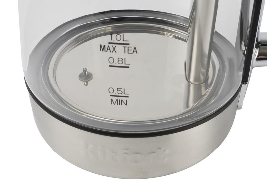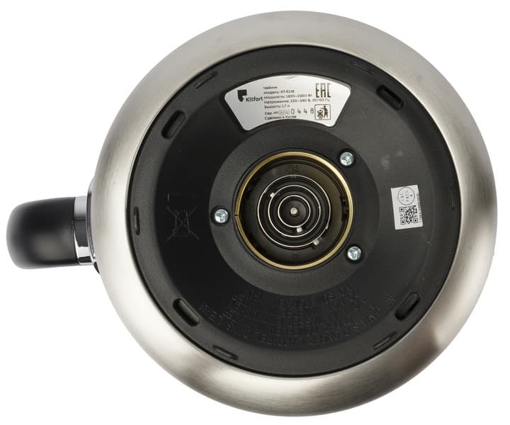 Из плоского металлического дна выступает колпачок термодатчика: такая конструкция обеспечивает более точное измерение температуры. Полная емкость чайника — 1,7 литров, но для заваривания чая доступен только литровый объем: если залить в колбу больше воды, дно контейнера с заваркой будет касаться поверхности жидкости, что приведет к увеличению времени приготовления чая и испортит его вкус. На боку колбы нанесены отметки минимального (0,5 л), оптимального для чая (0,8—1 л) и максимального (1,7 л) уровней.