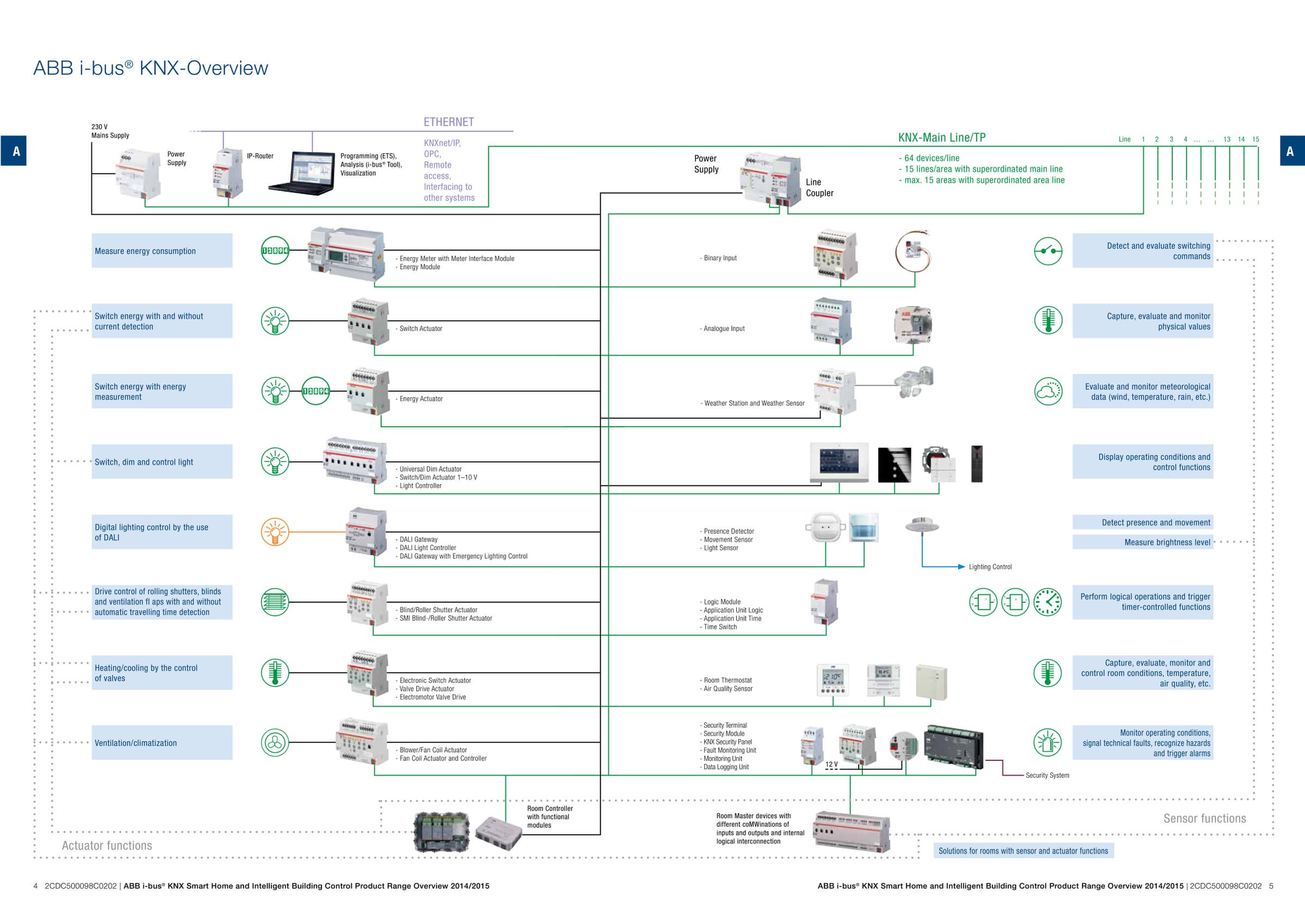 Разнообразие устройств данного стандарта можно оценить по представленным на сайтах крупнейших производителей каталогам. В частности последние версии у ABB и Schneider Electric имеют примерно 200 страниц, а у Gira — около 100 (часть каталога о решениях KNX). Конечно, это достаточно грубая оценка, но она вполне дает представление об интересе производителей к данной продукции. Даже одно перечисление возможных групп товаров займет не одну строку: реле (включая управление шторами, жалюзи, воротами), диммеры, кнопки и выключатели, бинарные и аналоговые входы и выходы, датчики (движения, освещенности, температуры, энергопотребления, погоды, протечки воды, дыма, утечки газа), управление климатом (нагрев, вентиляция, кондиционирование), сенсорные панели, мосты в другие системы (IP, DALI, SMS, телефон, электронная почта, домофон, охранные системы), системные компоненты (блоки питания, мосты, интерфейсы программирования, контроллеры).
