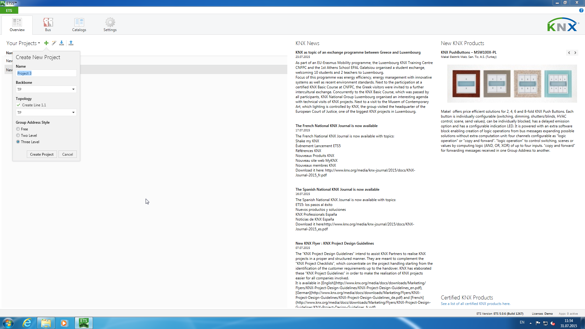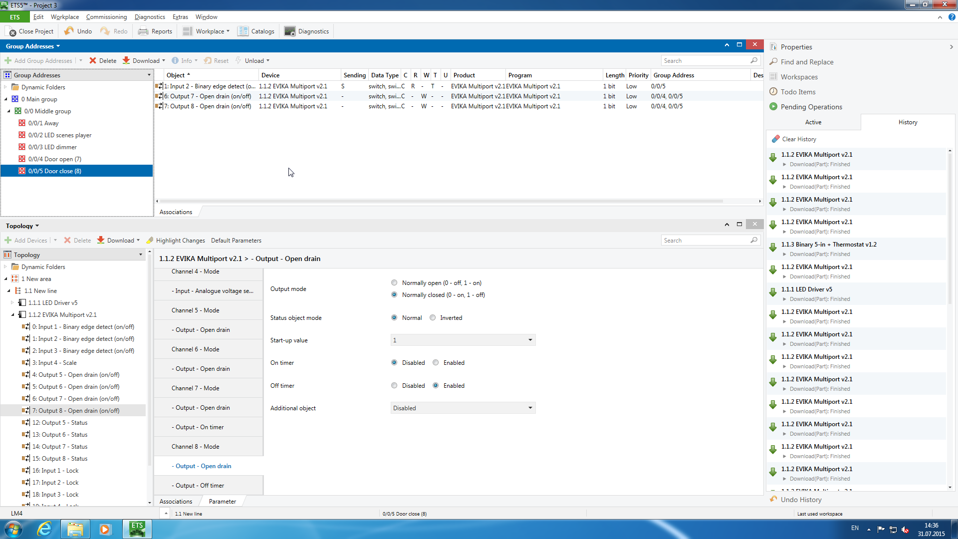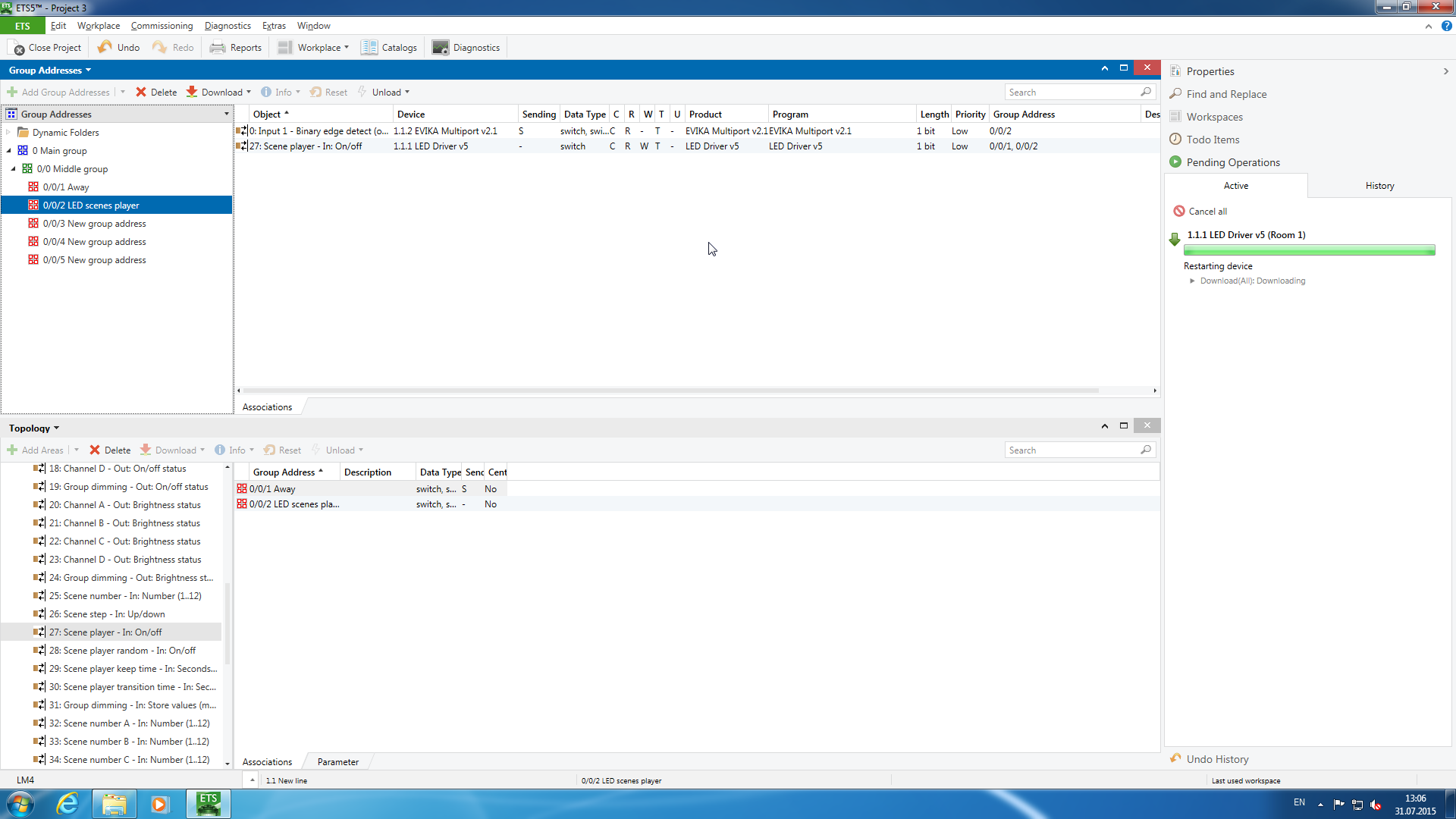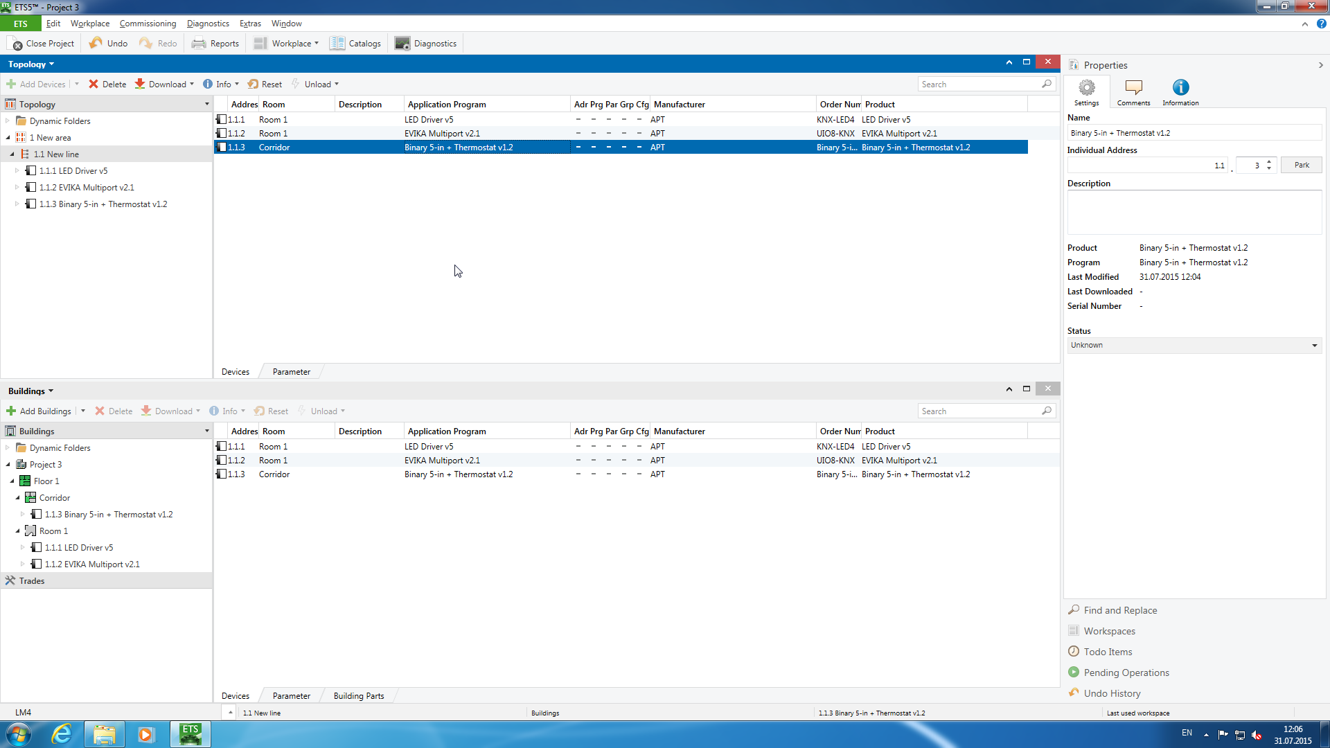 Рабочим документом в ней является проект. При этом можно использовать несколько проектов в одной сети (например, в крупном здании) или несколько сетей с одним проектом (например, в однотипных номерах отеля). Непосредственная работа с проектом не требует доступа к инсталляции, однако для загрузки конфигурации и диагностики, конечно, нужно будет подключиться к сети KNX. Осуществляется эта операция или через локальные (USB или RS-232) интерфейсы или IP-мост.