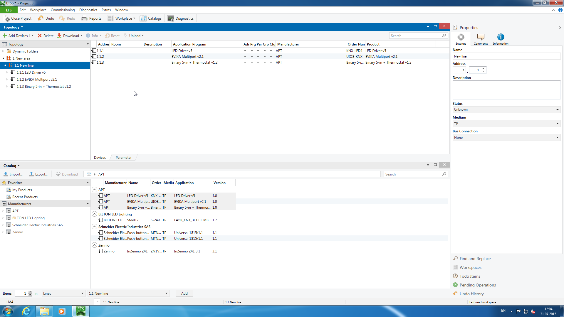 Далее открываем одновременно окна топологии и каталога и добавляем три устройства на нашу единственную линию шины. Адреса устройства получают автоматически.