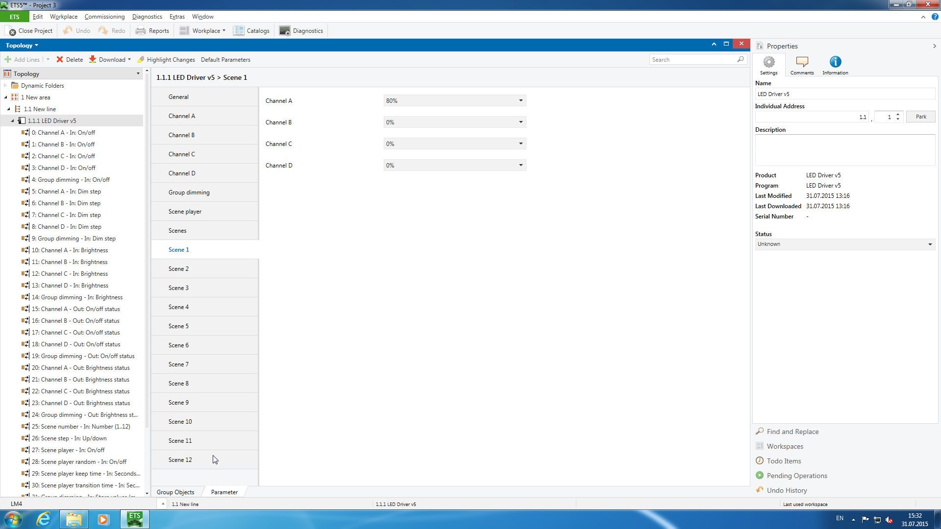 На следующем этапе необходимо проверить и настроить параметры всех устройств и их объектов. Для LED-диммера мы запрограммируем три внутренние сцены и параметры для их автоматического проигрывания.