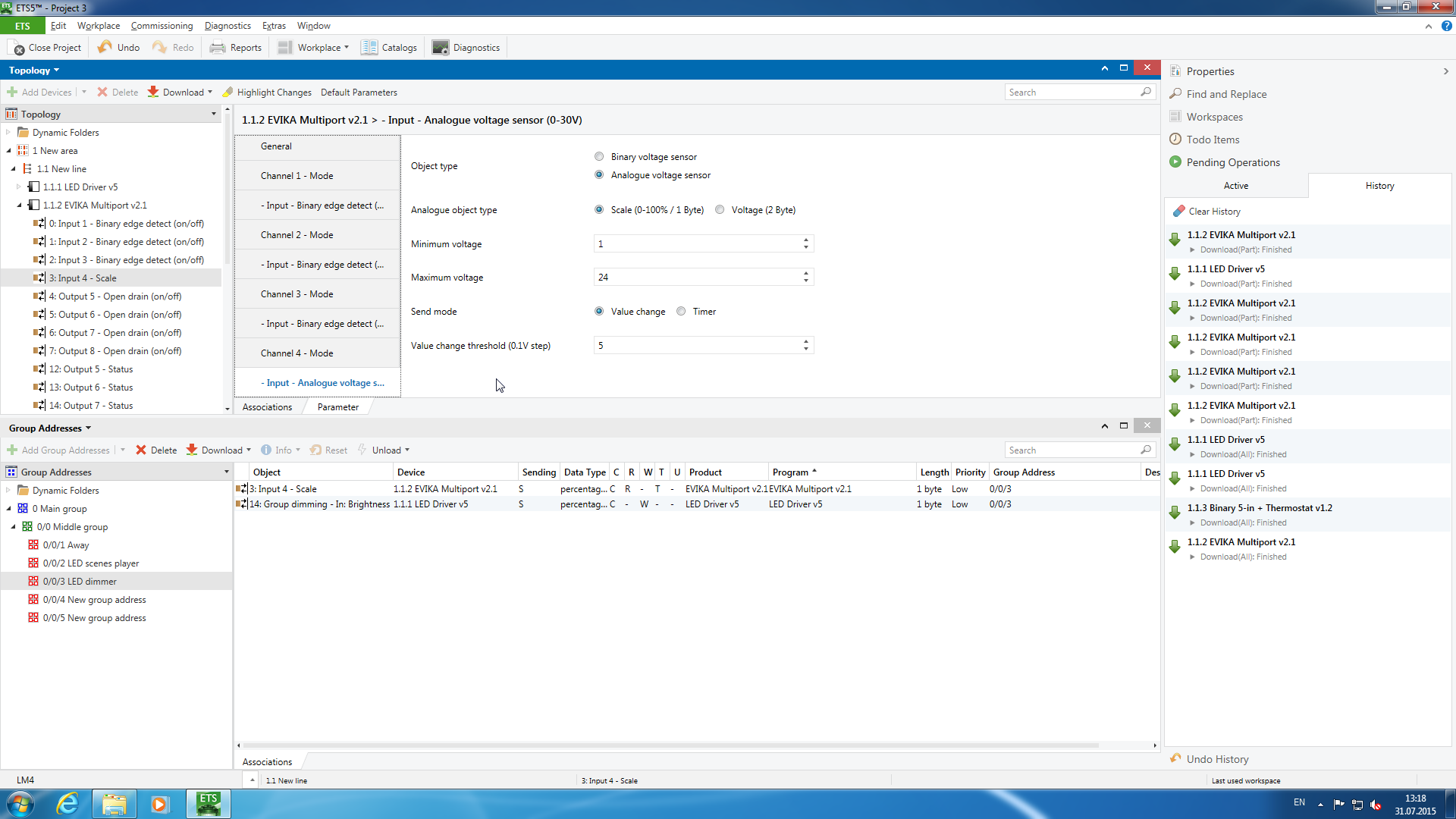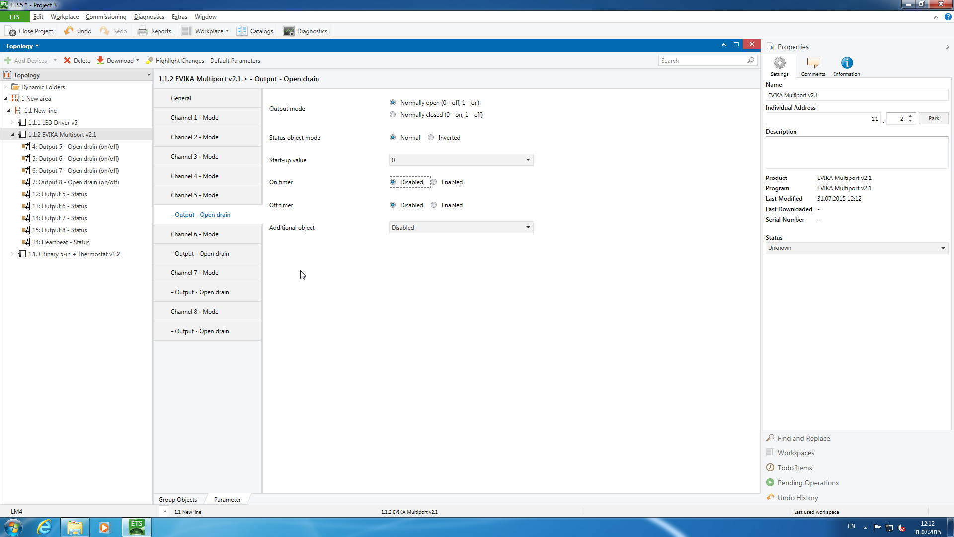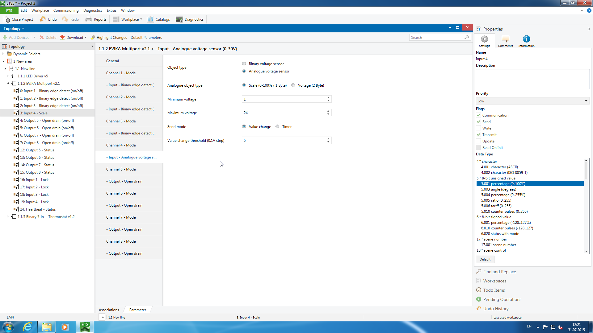 При выборе режимов каналов в устройстве автоматически появились соответствующие объекты со своими параметрами. В частности для выключателя настроим отправку 1 при замыкании и 0 при размыкании, для кнопок — переключение при замыкании, для аналогового входа важным является максимальное напряжение (ставим здесь 24 В), а также режим отправки телеграмм — при изменении состояния или по таймеру.