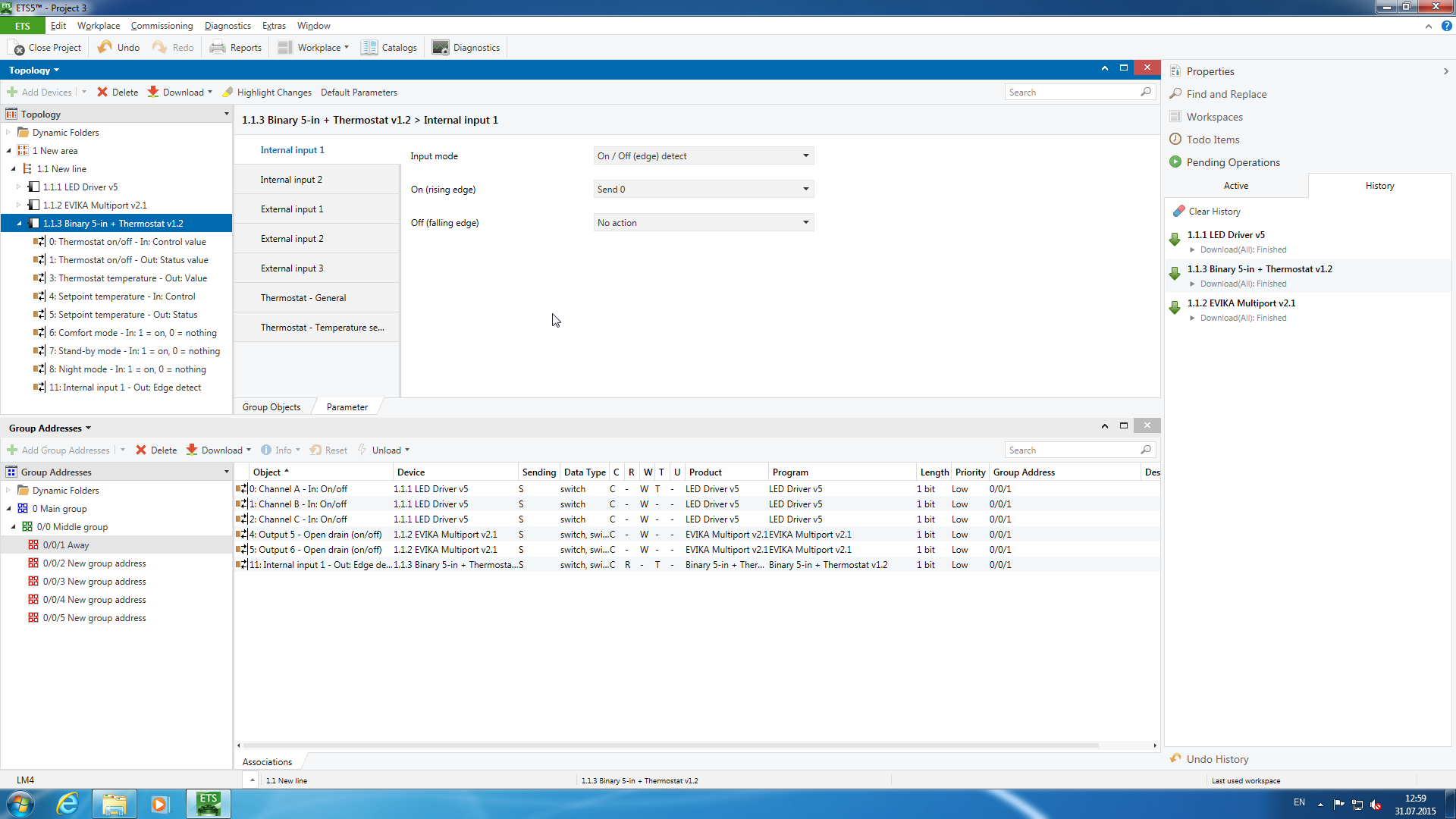 Если загрузка производится в первый раз, необходимо прописывать адреса во все устройства. Для этого нужен будет физический доступ к ним для нажатия кнопки программирования. В зависимости от особенностей проекта, возможно будет удобнее осуществить эту операцию заранее, промаркировать все элементы и потом монтировать оборудование на объекте.