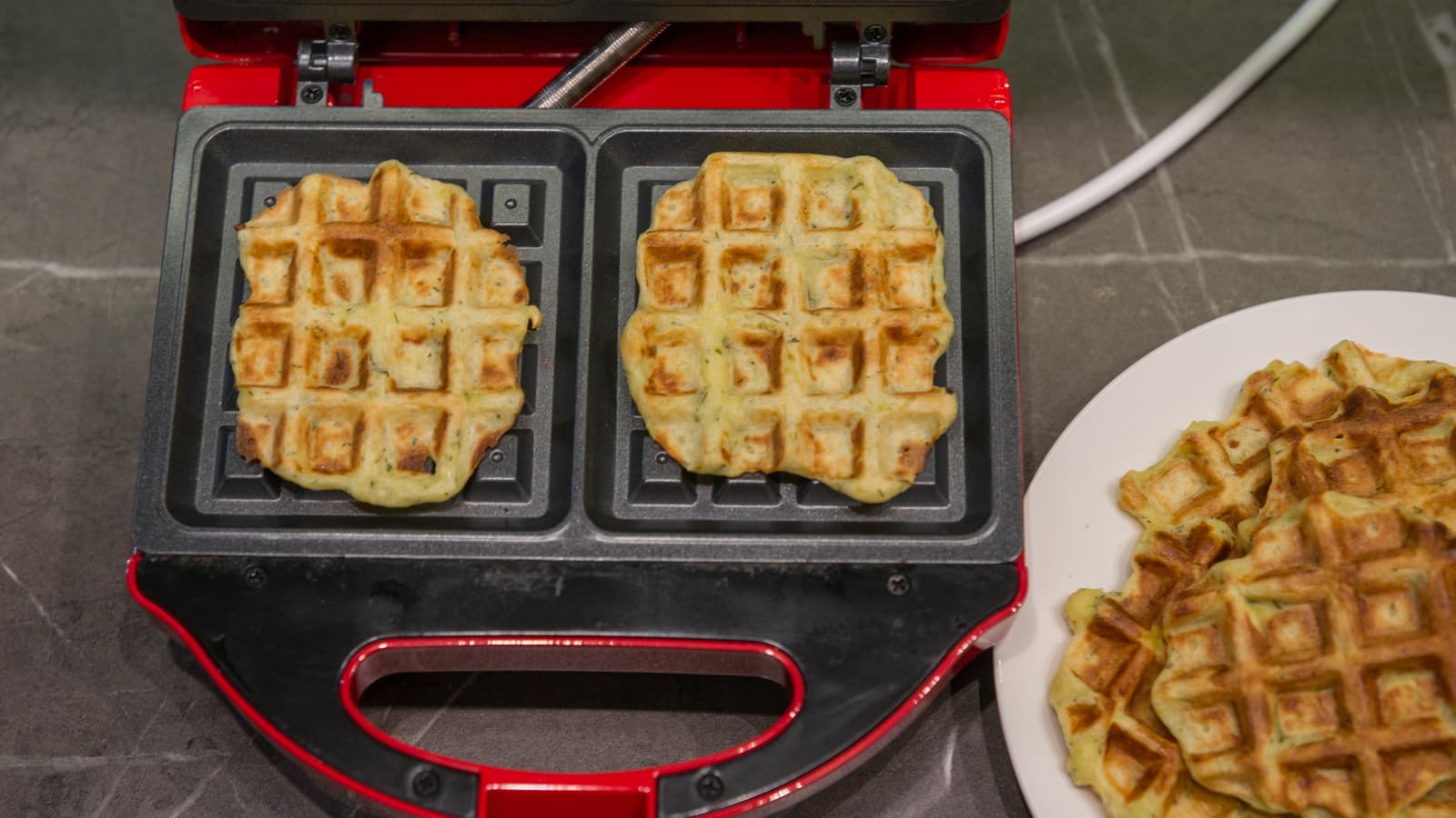 Заранее подготовленное картофельное пюре с молоком и сливочным маслом смешали с просеянной мукой, измельченным укропом, солью и парой яиц. Разогрели вафельницу в закрытом виде, выложили картофельную массу на панели, разровняли ложкой и закрыли вафельницу.