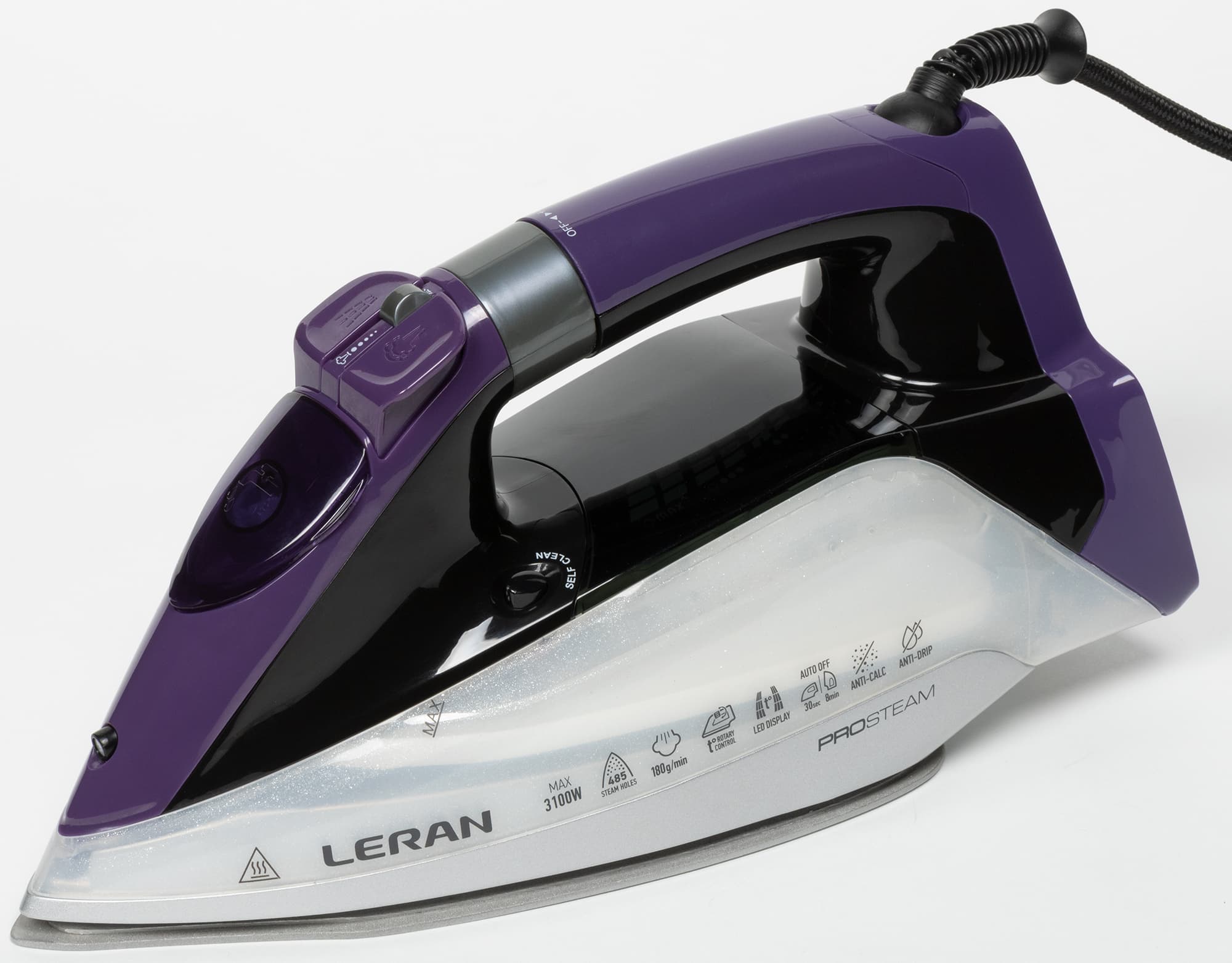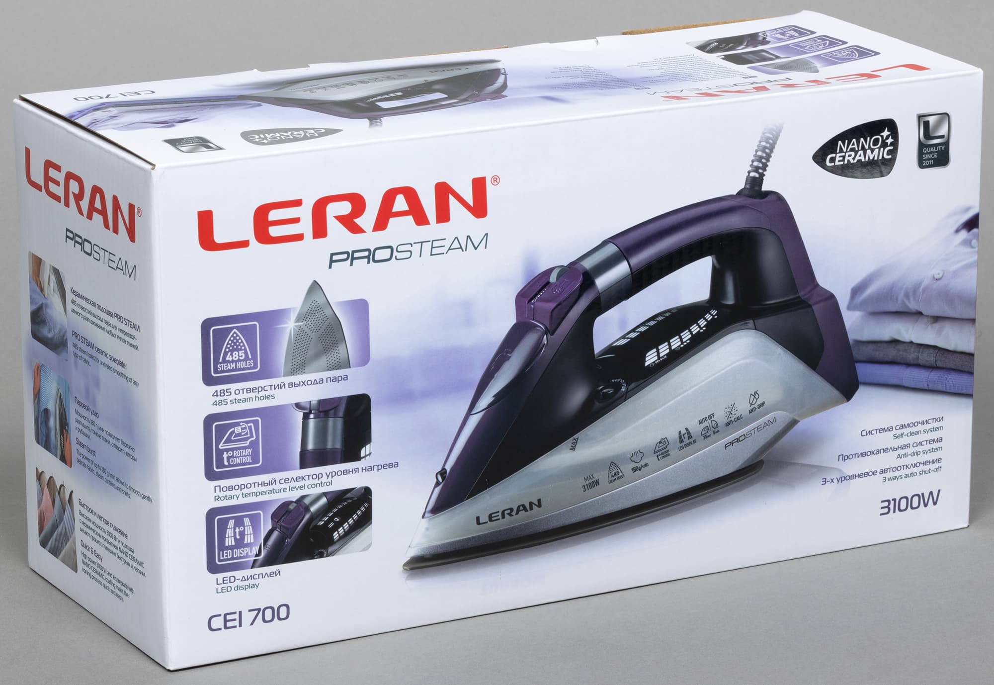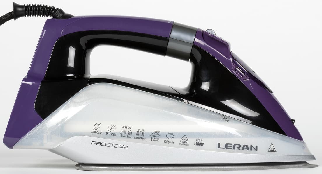 Leran CEI 700 мощностью 3100 Вт умеет всё, что обычно требуется от утюга: отпаривает на разных режимах в горизонтальном и вертикальном положении, оснащен функцией парового удара, керамической подошвой с 485 отверстиями для выхода пара, противокапельной системой и автоотключением на случай, если про него забыли.