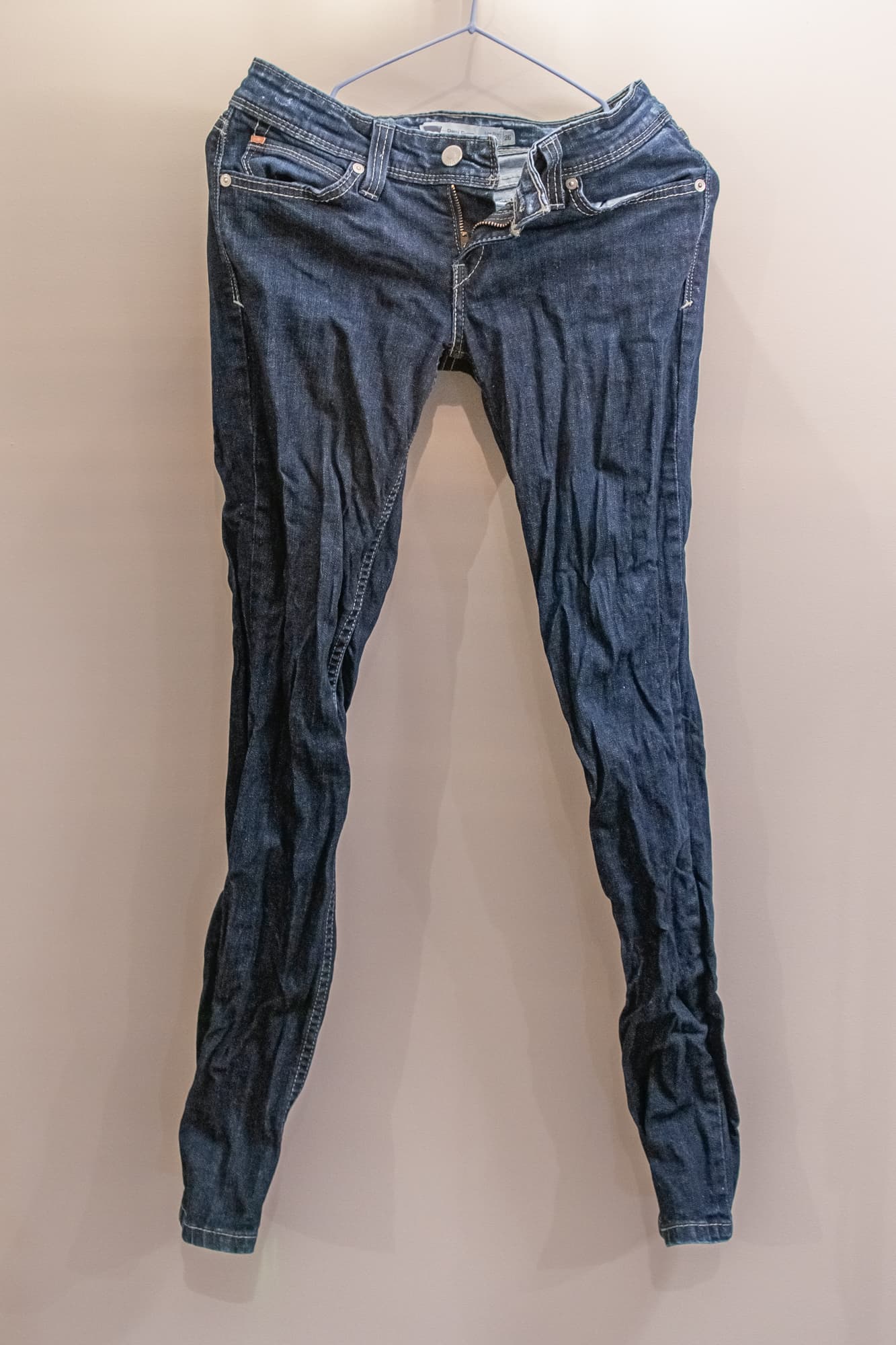 Джинсы из очень плотной ткани при стирке в машине были измяты отжимом на высоких оборотах и дополнительно пересушены на батарее.