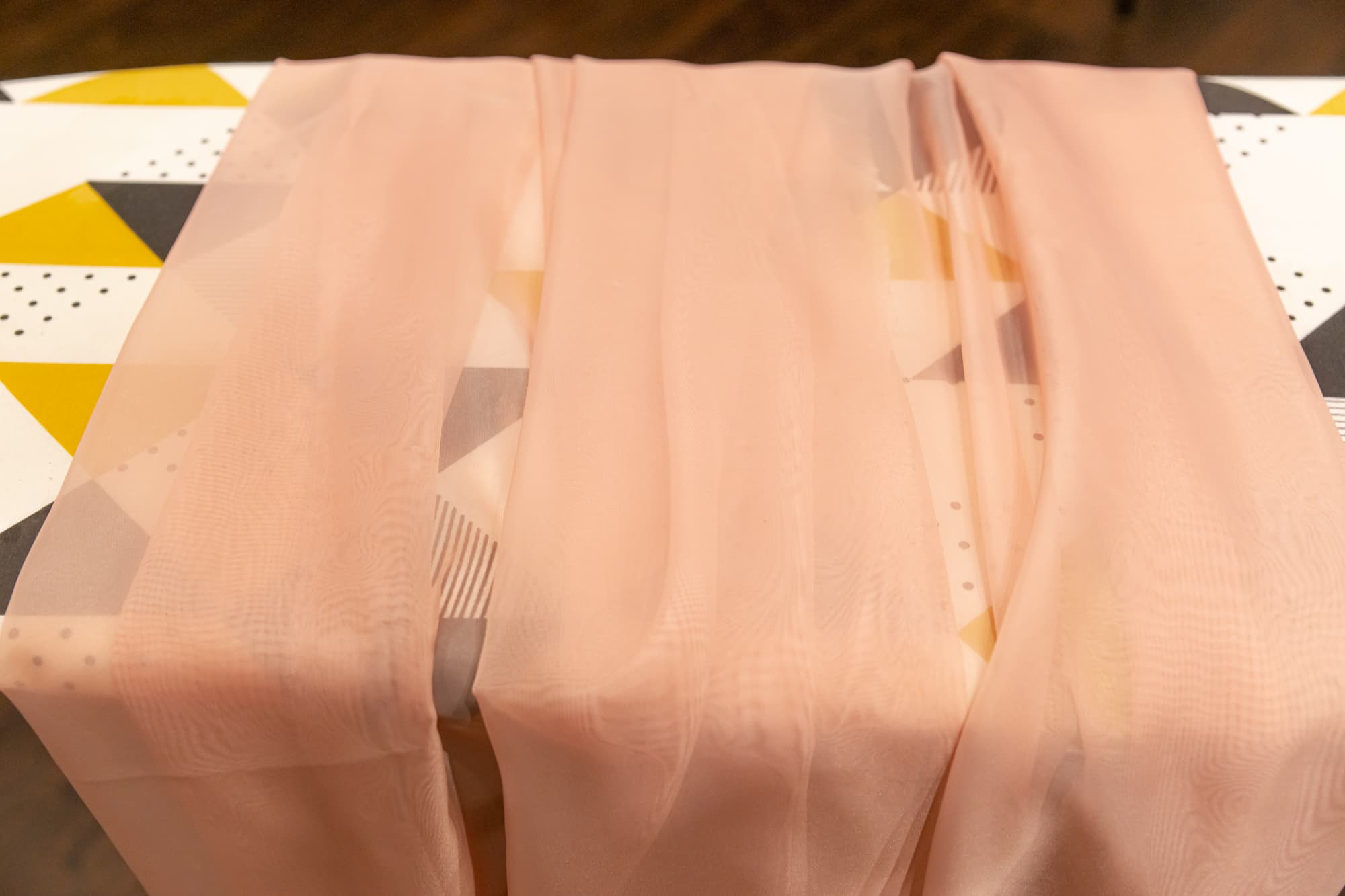 Разложив органзу на гладильной доске, мы продолжили. По идее, эту ткань следует приводить в порядок на режиме I, без пара. Мы попробовали, но ткань разглаживалась слишком медленно. Даже при прохождении утюга по одному и тому же месту несколько раз часть складок оставалась заметной. Тогда мы вернули режим II и поставили регулятор подачи пара на минимум. Теперь, за считанные минуты мы получили идеально выглаженную ткань. Паровой удар не понадобился. Повышение температуры и пар ткань не испортили.