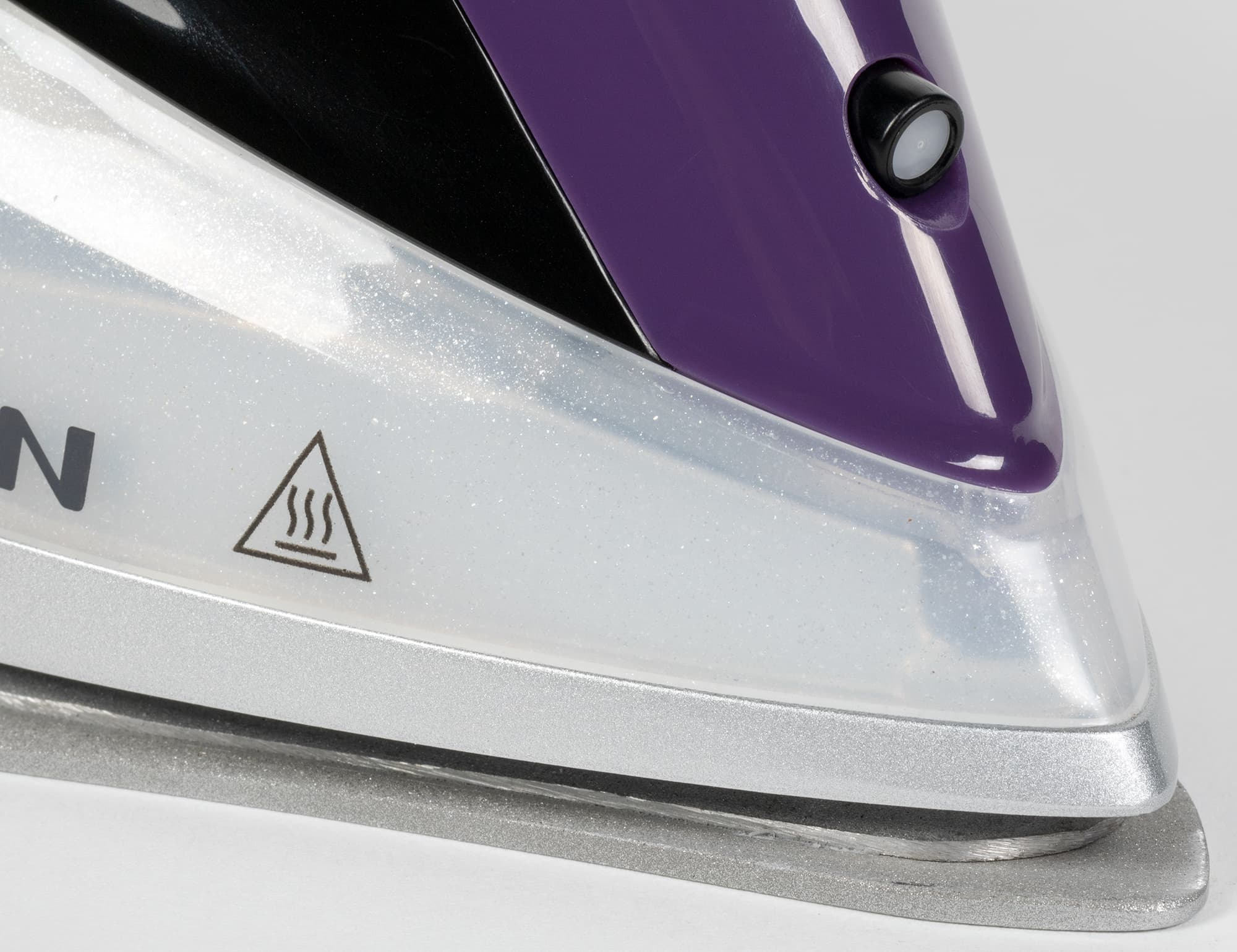 Поверхность обработана слегка шершавым на ощупь керамическим покрытием. Покрытие нанесено ровным слоем, никаких сколов или царапин мы не обнаружили. 485 отверстий (мы пересчитали) для выхода пара расположены четырьмя блоками: два по бокам, один внизу и еще один на носике.