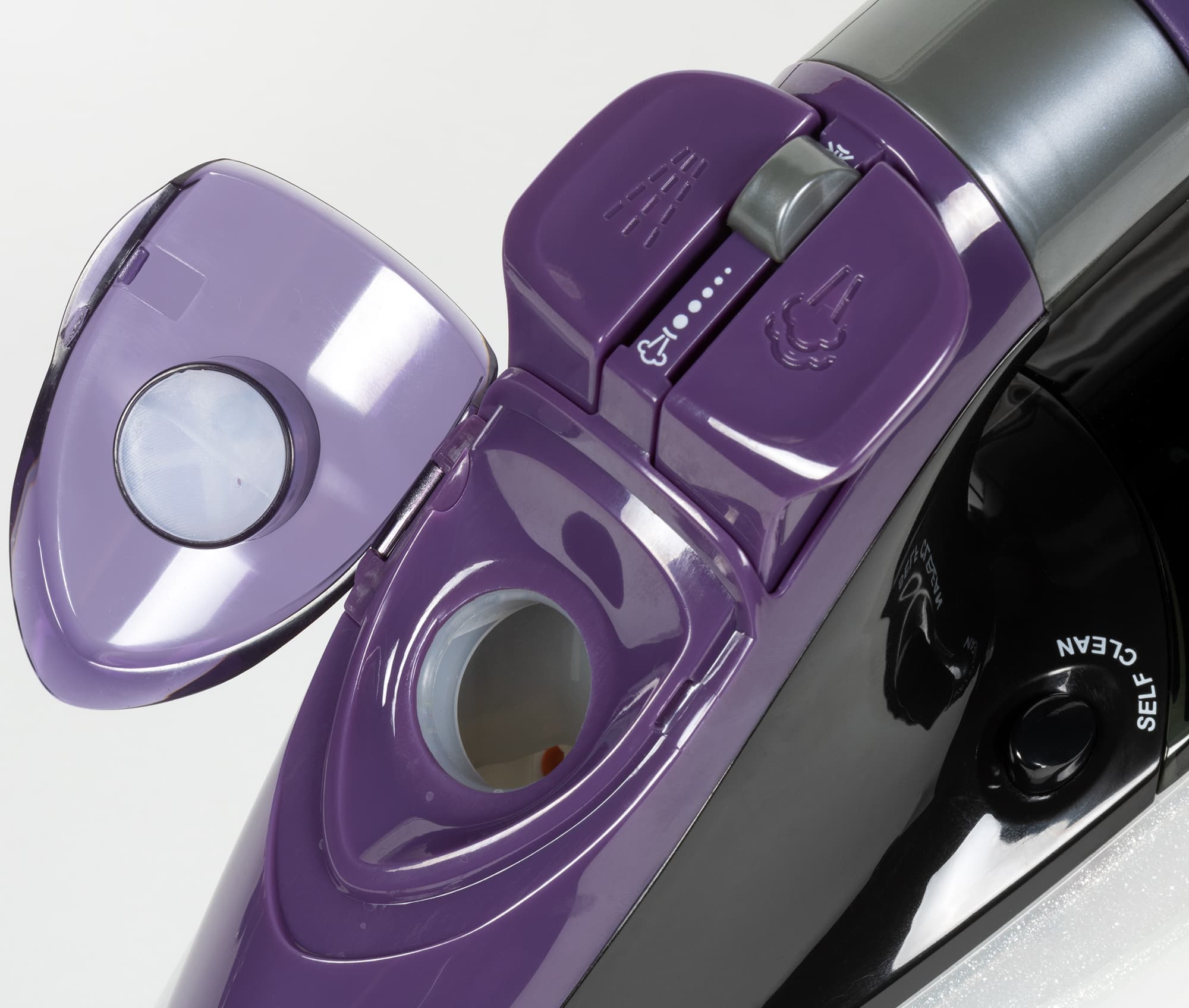 Ниже идет откидная крышка отсека для залива воды, а в самом низу у носика — сопло разбрызгивателя.