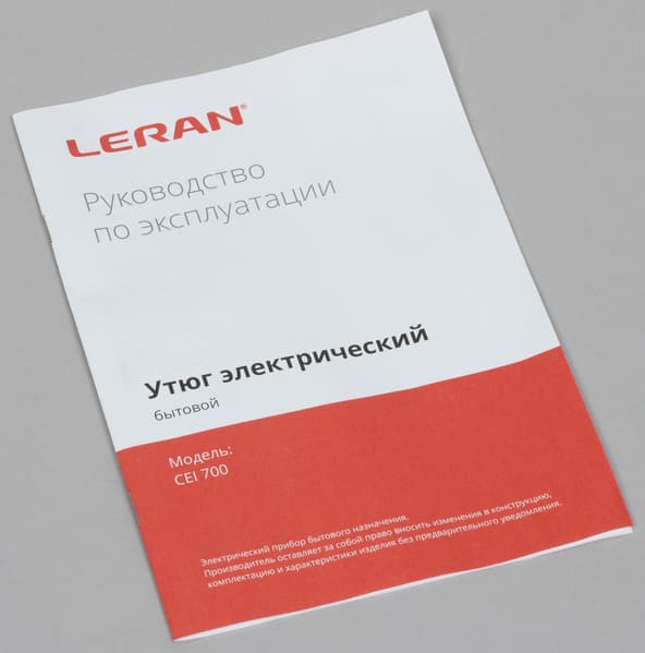 Конструкция Leran CEI 700 классическая: корпус со встроенным резервуаром для воды, гладкая подошва и ручка с элементами управления. В оформлении корпуса использован пластик черного, фиолетового, серого и серебристого цветов. Размеры утюга стандартны. Вес не самый легкий — 1,32 кг.